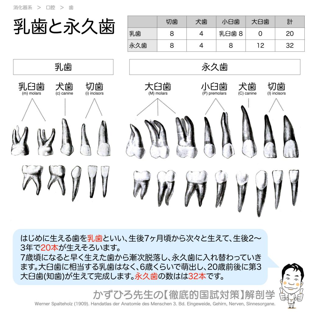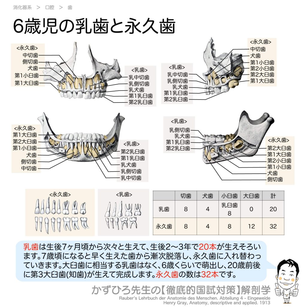 乳歯と永久歯 - 完全攻略ガイド はじめに 歯は乳歯から永久歯へと生え変わります。乳歯は20本、永久歯は32本という数字は国家試験で頻出です。また、乳歯には大臼歯がないこと、第1大臼歯(6歳臼歯)が最初に生える永久歯であることも重要なポイントです。... -