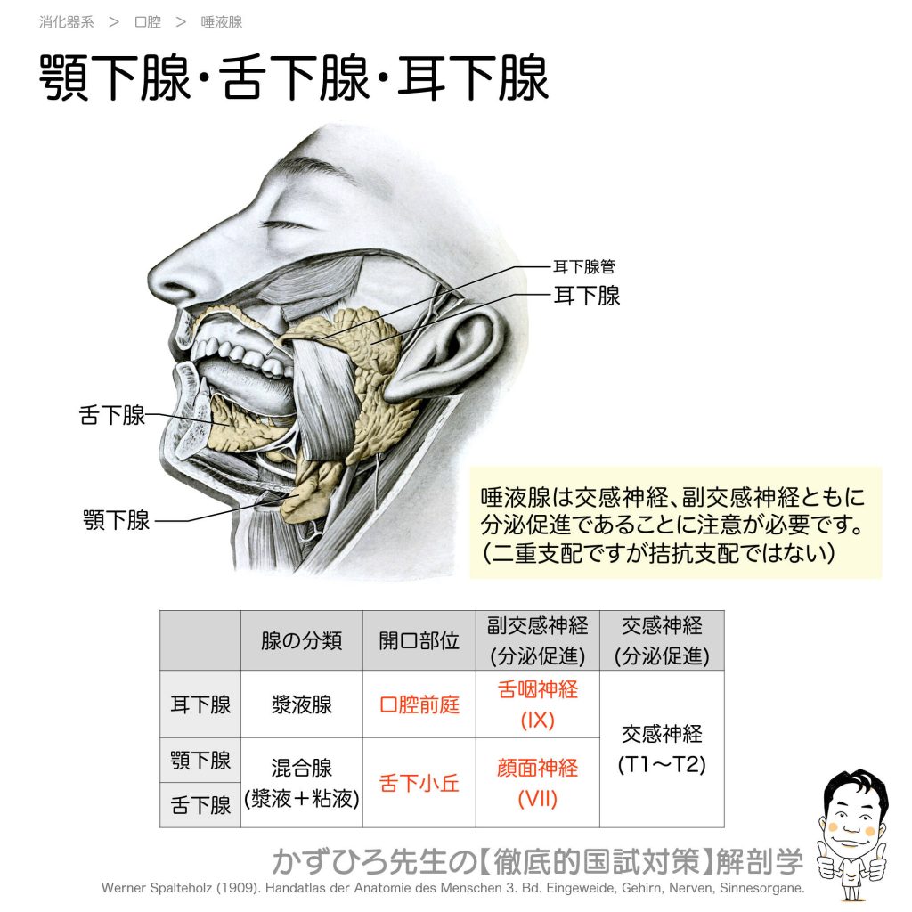 顎下腺・舌下腺・耳下腺(三大唾液腺) - 完全攻略ガイド はじめに 唾液腺は唾液を分泌する腺で、大唾液腺(耳下腺・顎下腺・舌下腺)と小唾液腺に分類されます。国家試験では、各唾液腺の分類(漿液腺・混合腺)、開口部位、神経支配が頻出です。特に「交... -