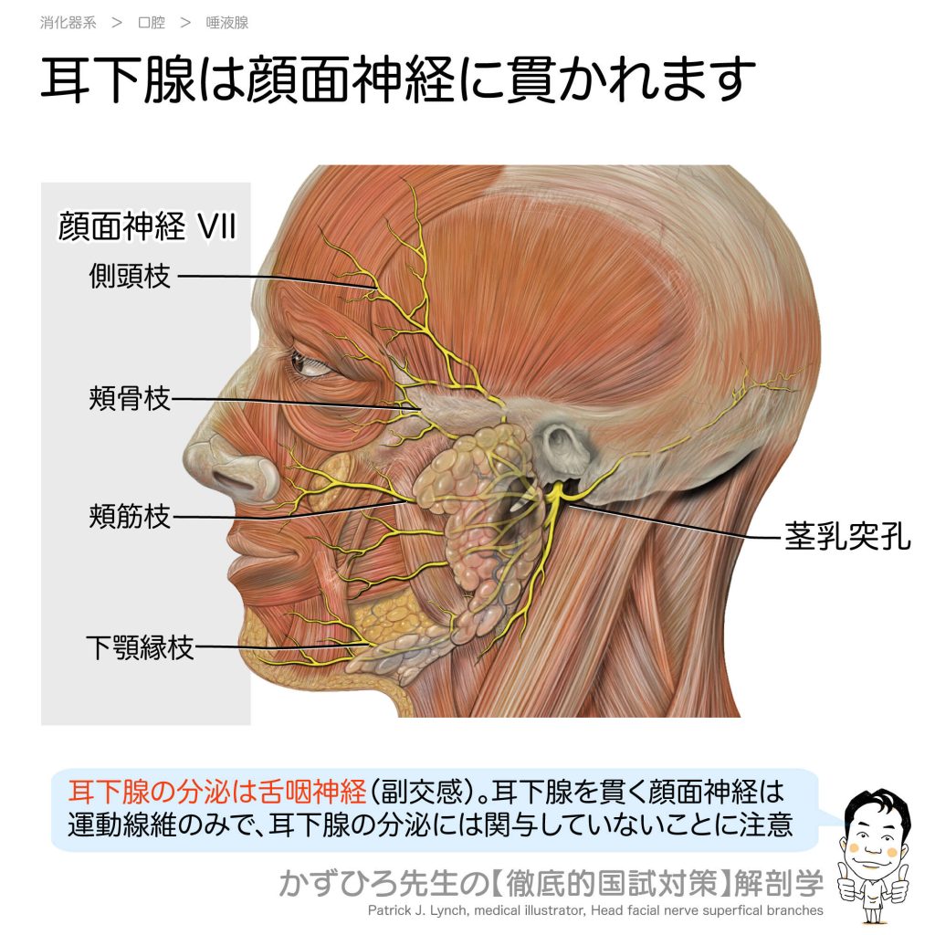 耳下腺は顔面神経に貫かれる - 完全攻略ガイド はじめに 耳下腺は顔面神経(VII)に貫かれていますが、耳下腺の分泌は顔面神経ではなく舌咽神経(IX)が担当しています。この「貫くけど支配しない」という関係は国家試験で頻出のひっかけポイントです。し... -