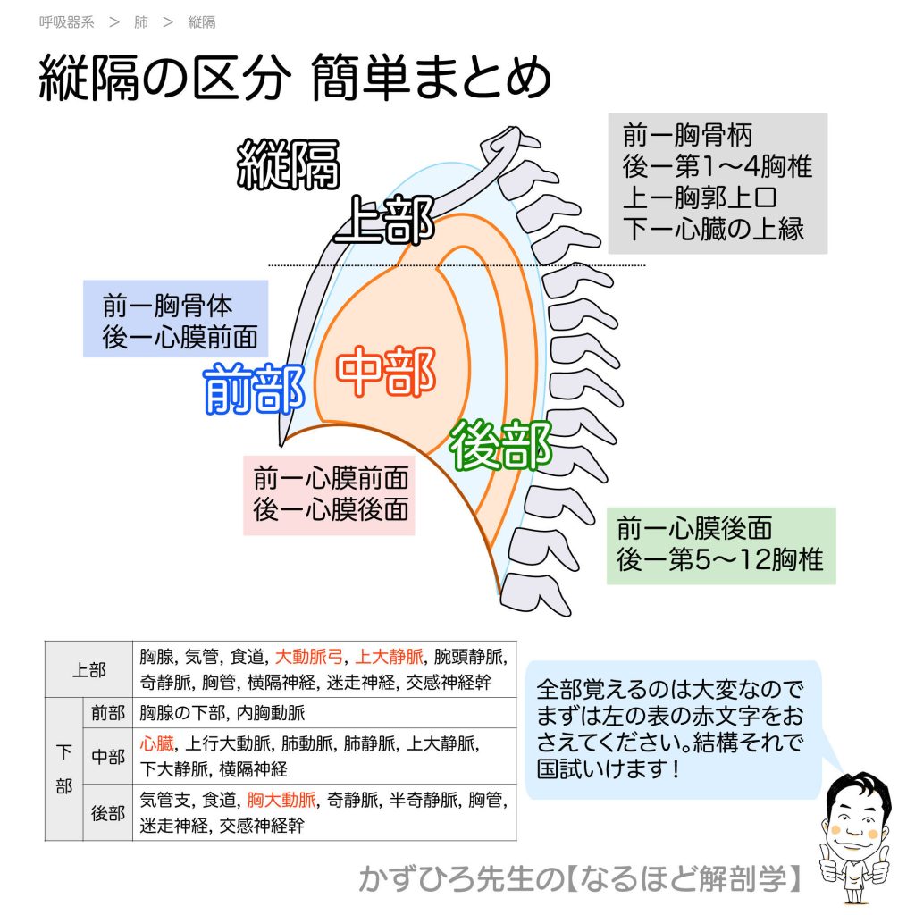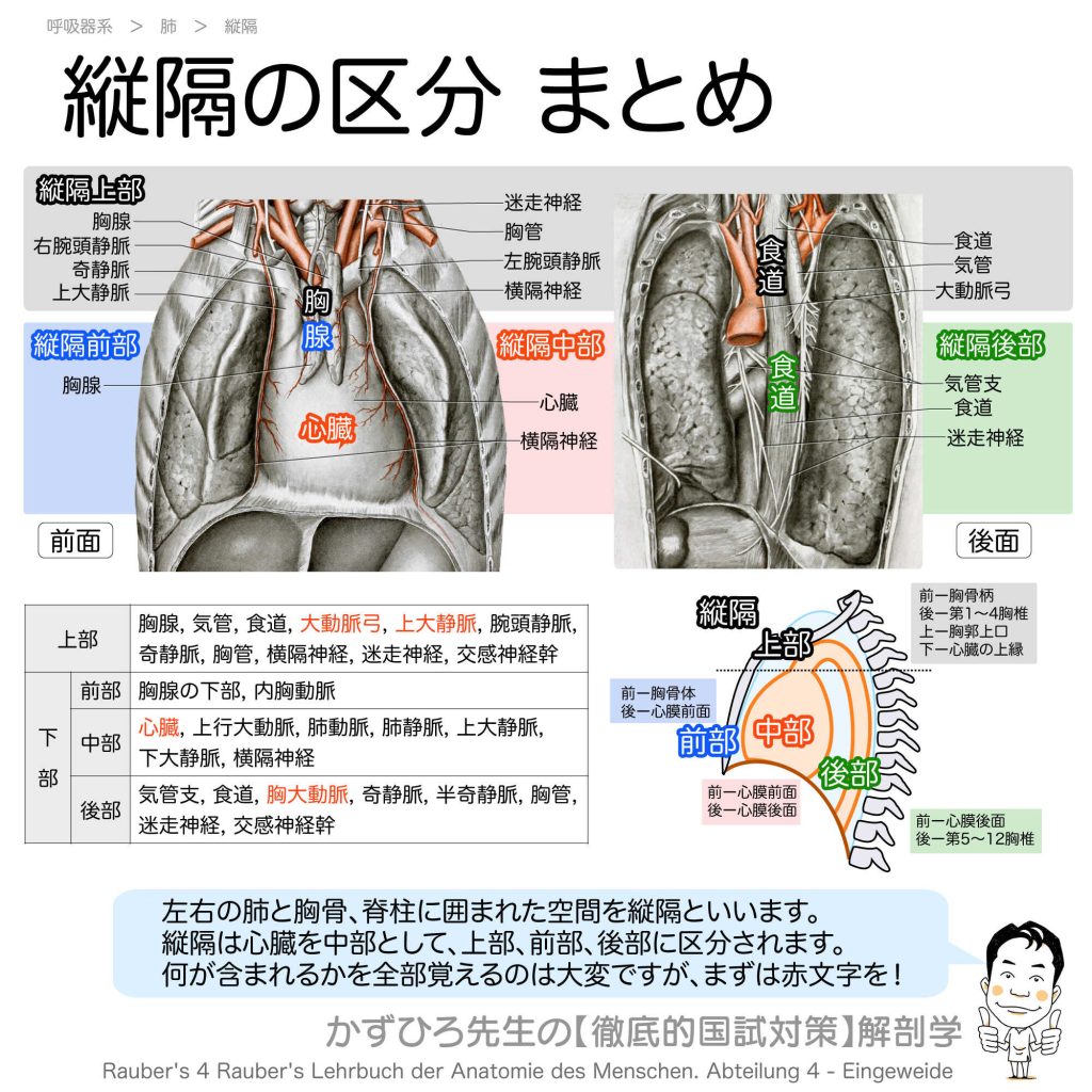 縦隔の区分 まとめ - 完全攻略ガイド はじめに 縦隔は左右の肺に挟まれた胸腔の中央部分で、心臓や大血管、気管、食道などが含まれます。縦隔の区分と各区分に含まれる構造物は国試頻出です。この記事では、縦隔の区分と含まれる構造物を詳しく解説します... -
