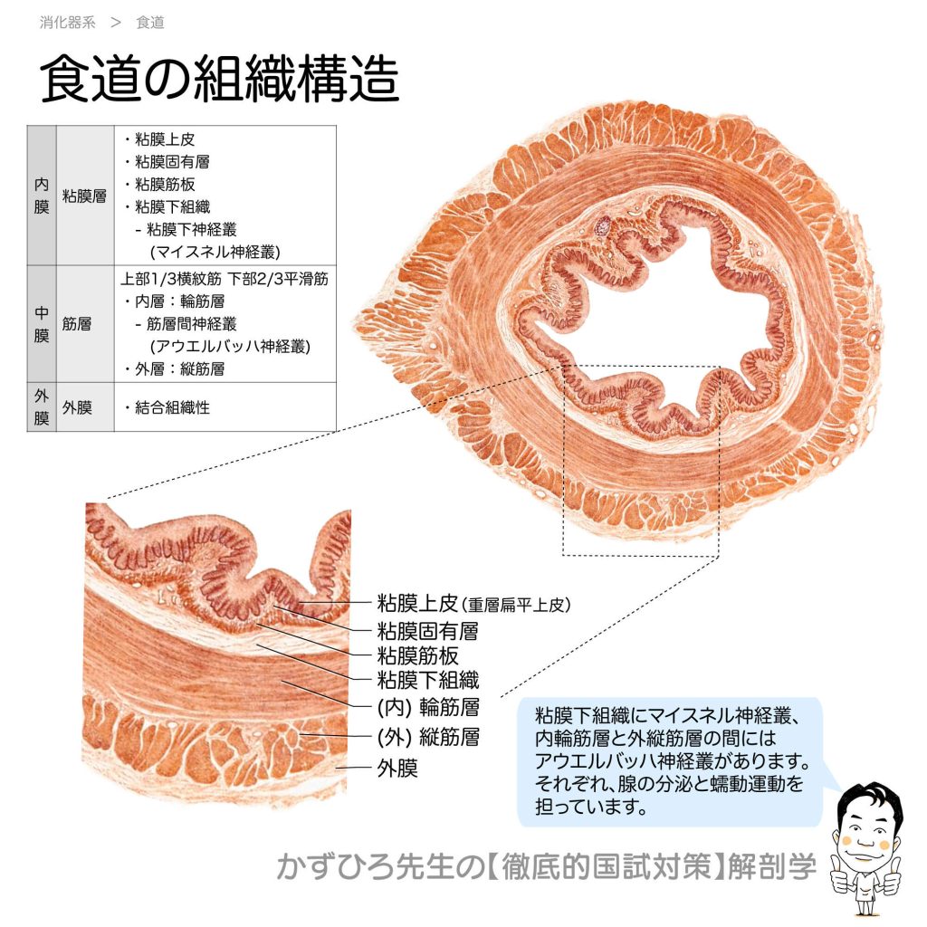 食道の組織構造 - 完全攻略ガイド はじめに 食道の組織構造は消化管の基本構造に従いますが、いくつかの特徴があります。特に「上部1/3は横紋筋、下部2/3は平滑筋」という筋層の特徴は国家試験で頻出です。壁内神経叢の位置と機能とあわせて理解しましょう... -