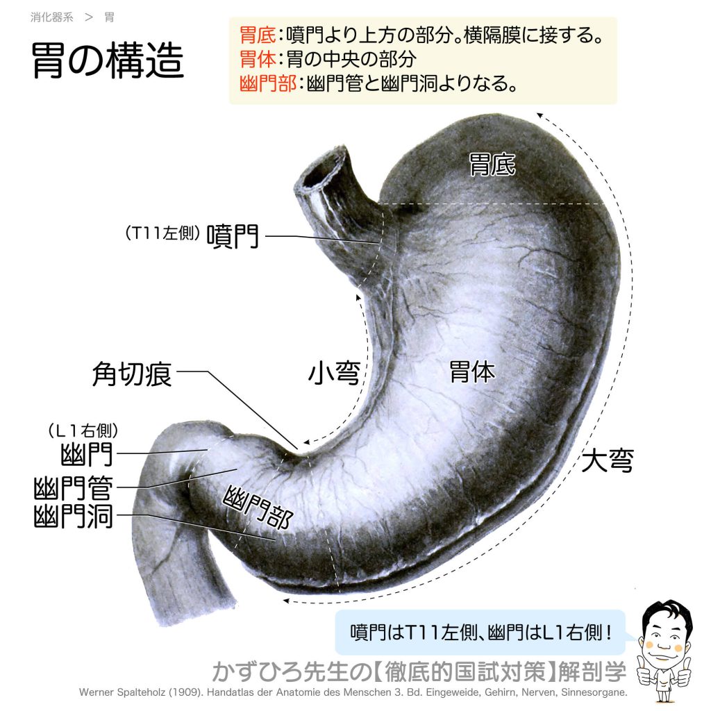 胃の構造 - 完全攻略ガイド はじめに 胃は消化管の中で最も膨らんだ器官で、食物を一時的に貯蔵し、消化を行います。胃の区分(胃底・胃体・幽門部)と各部位の脊椎高位は国家試験で超頻出です。特に「噴門はT11左側、幽門はL1右側」は必ず覚えましょう。 ... -