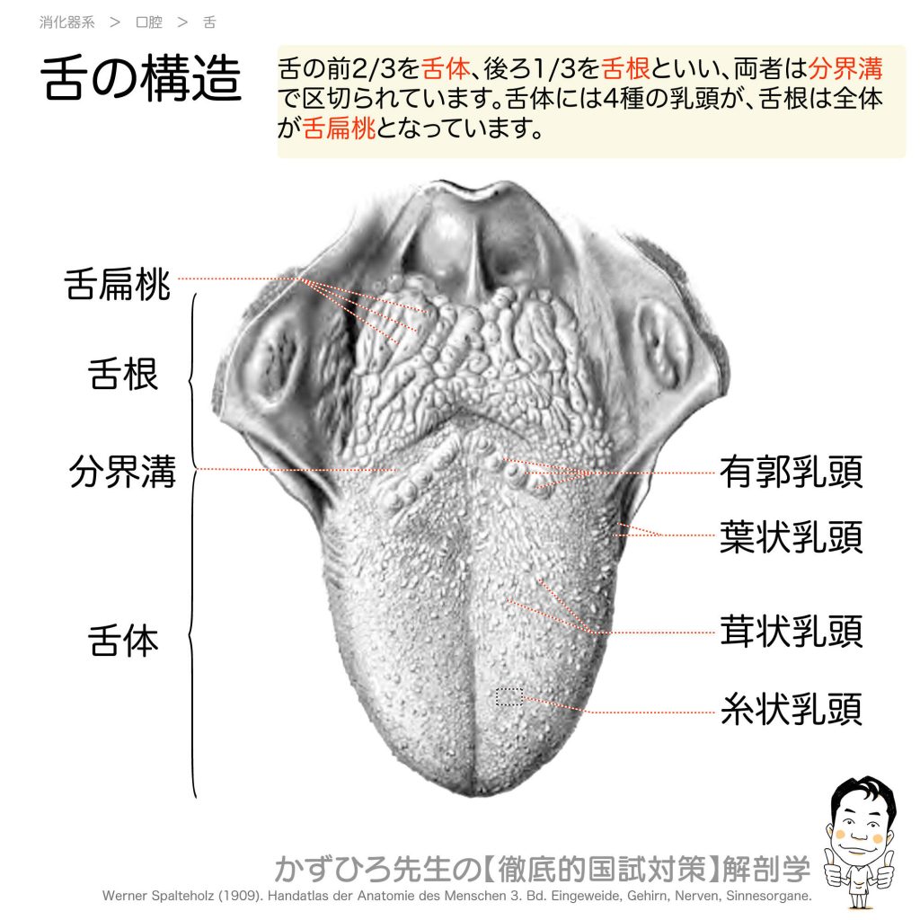 舌の構造 - 完全攻略ガイド はじめに 舌は味覚、咀嚼、嚥下、発声に関わる重要な器官です。舌体と舌根の区分、4種類の舌乳頭、舌扁桃など、国家試験では舌の構造について頻繁に出題されます。分界溝を境とした前後の違いをしっかり理解しましょう。 詳しい... -