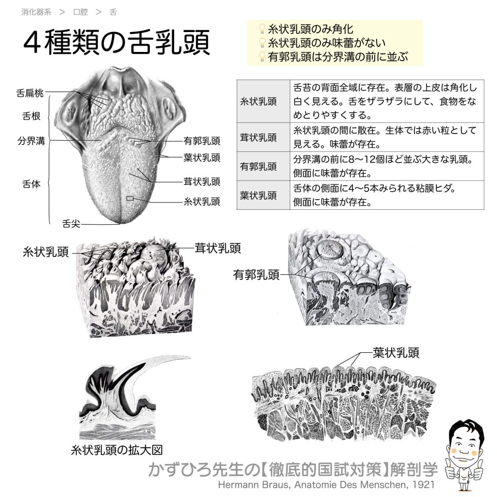 4種類の舌乳頭 - 完全攻略ガイド はじめに 舌乳頭は舌体(前2/3)に存在する小さな突起で、味覚や食物の移動に重要な役割を果たしています。4種類の舌乳頭(糸状・茸状・有郭・葉状)の特徴と違いは国家試験で頻出のテーマです。特に「糸状乳頭だけ味蕾が... -