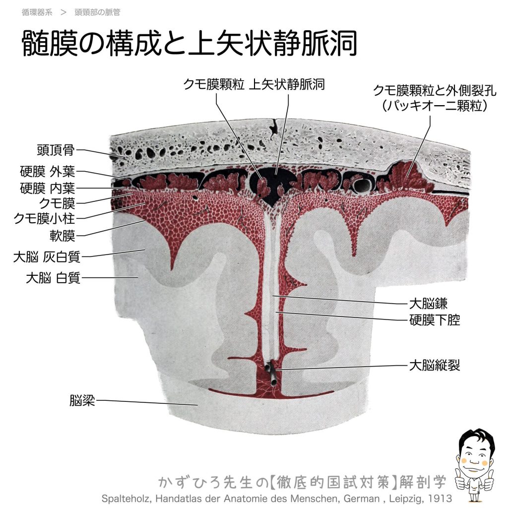 髄膜の構成と上矢状静脈洞 - 完全攻略ガイド はじめに 髄膜は外側から硬膜・クモ膜・軟膜の3層で構成され、脳と脊髄を保護しています。クモ膜下腔には脳脊髄液が存在し、クモ膜顆粒を通じて上矢状静脈洞へ吸収されます。大脳鎌は硬膜の二重層で大脳縦裂に...