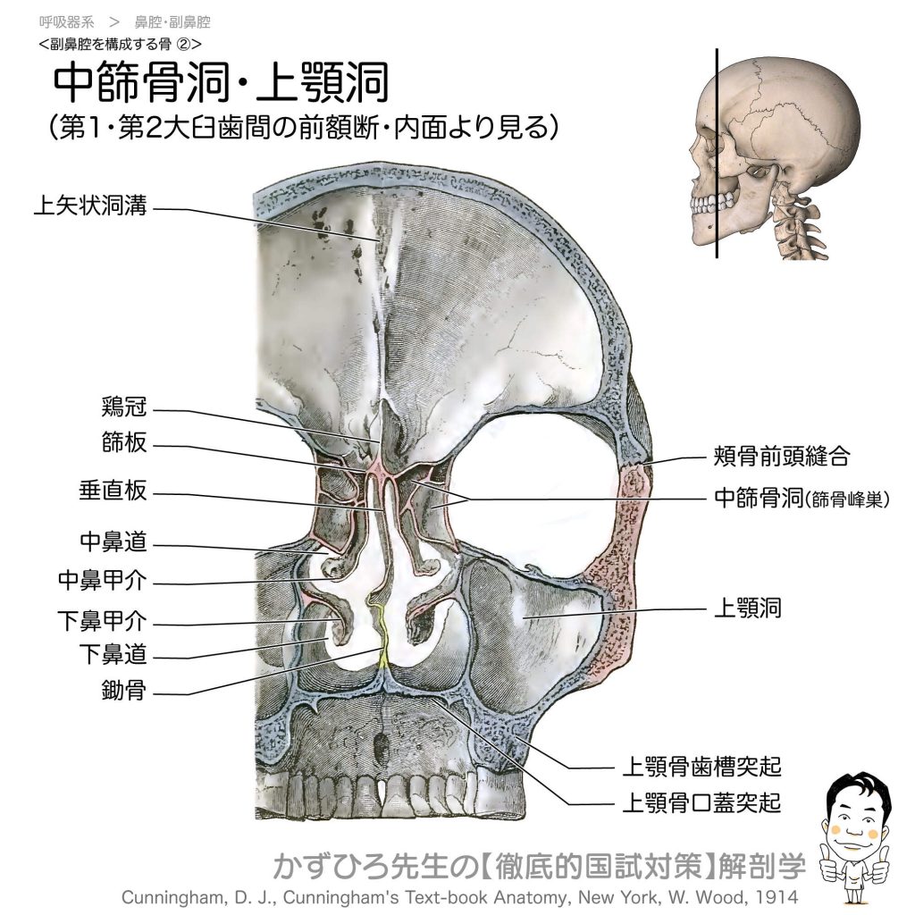 前頭洞・前篩骨洞・上顎洞(前額断) - 完全攻略ガイド はじめに 前額断(冠状断)は副鼻腔を観察する際に非常に有用な断面です。CTやMRIでも頻用される断面であり、国試でも画像問題として出題されることがあります。この記事では、前額断で観察できる副... -