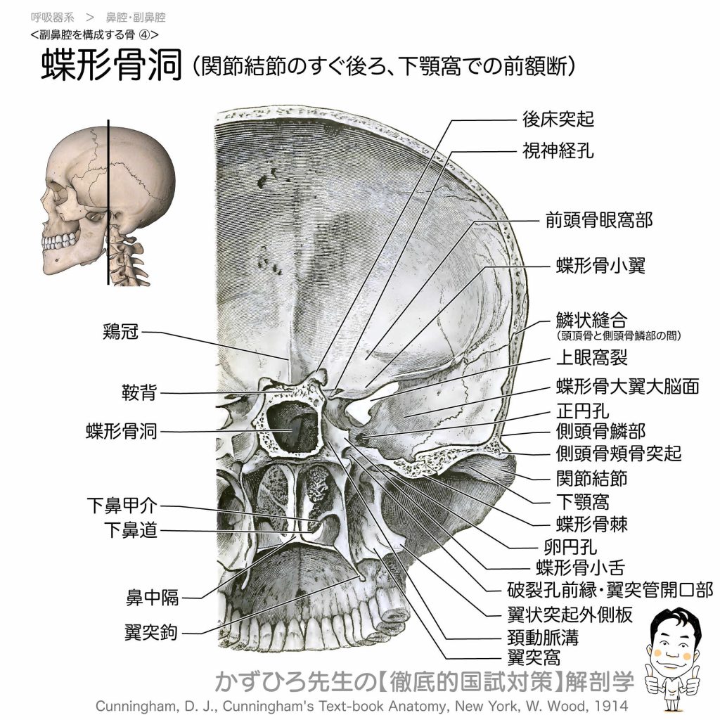 蝶形骨洞(翼口蓋窩での前額断) - 完全攻略ガイド はじめに 蝶形骨洞は蝶形骨体の内部に位置する副鼻腔で、他の副鼻腔とは異なり蝶篩陥凹から鼻腔後上方に開口します。翼口蓋窩での前額断では、蝶形骨洞と周囲の複雑な構造を観察できます。この記事では、... -