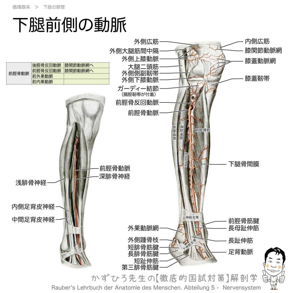 下腿前側の動脈 - 完全攻略ガイド はじめに 前脛骨動脈は膝窩動脈から分岐し、骨間膜を貫いて下腿前側を走行します。足関節の前方で足背動脈に移行し、足背の血液供給を担います。前脛骨動脈と深腓骨神経が併行することは国家試験で頻出のポイントです。 ... -