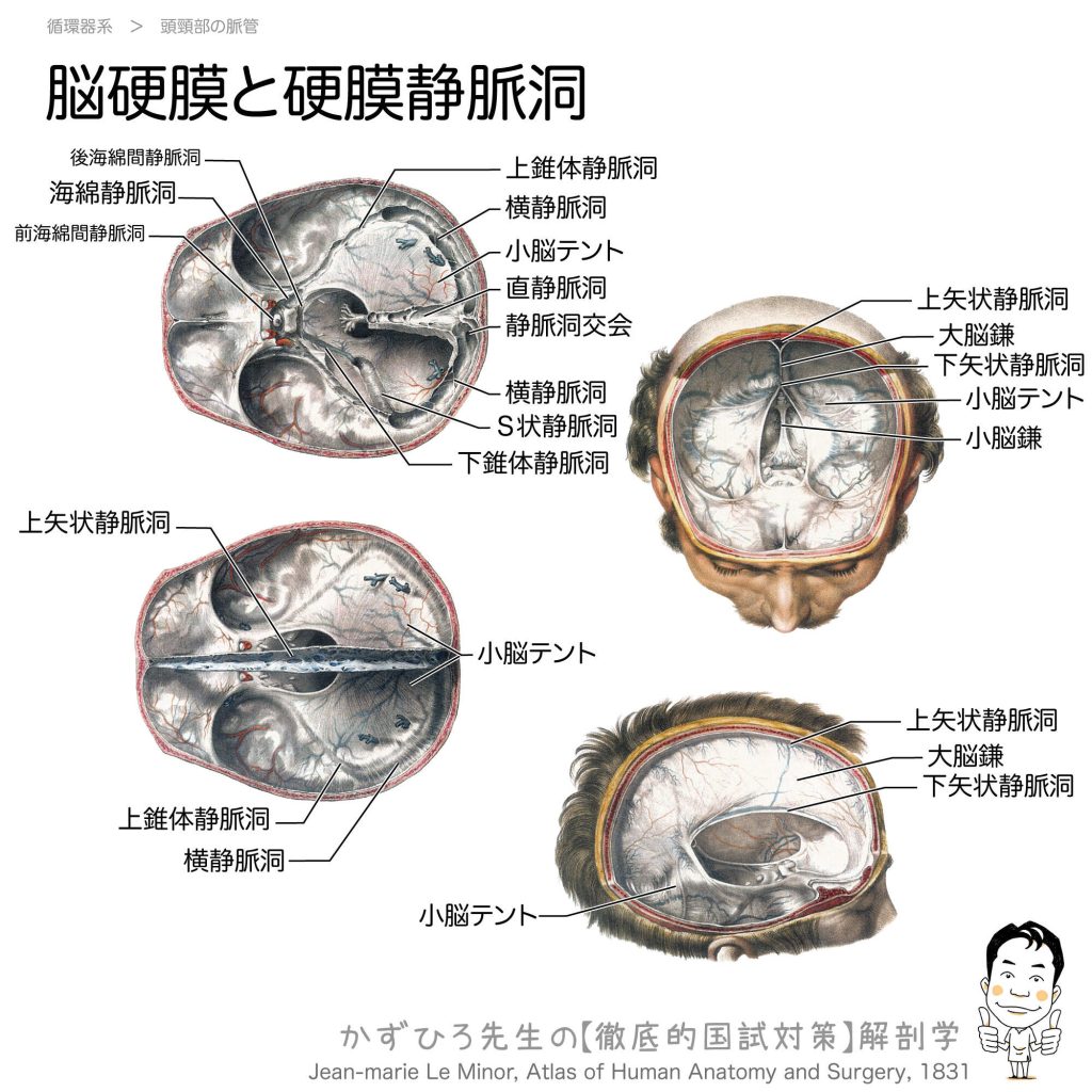脳硬膜と硬膜静脈洞 - 完全攻略ガイド はじめに 脳硬膜は大脳鎌、小脳テント、小脳鎌などのヒダを形成し、これらのヒダに沿って硬膜静脈洞が存在します。大脳鎌の上縁に上矢状静脈洞、下縁に下矢状静脈洞が存在し、静脈洞交会で合流します。小脳テントは大... -