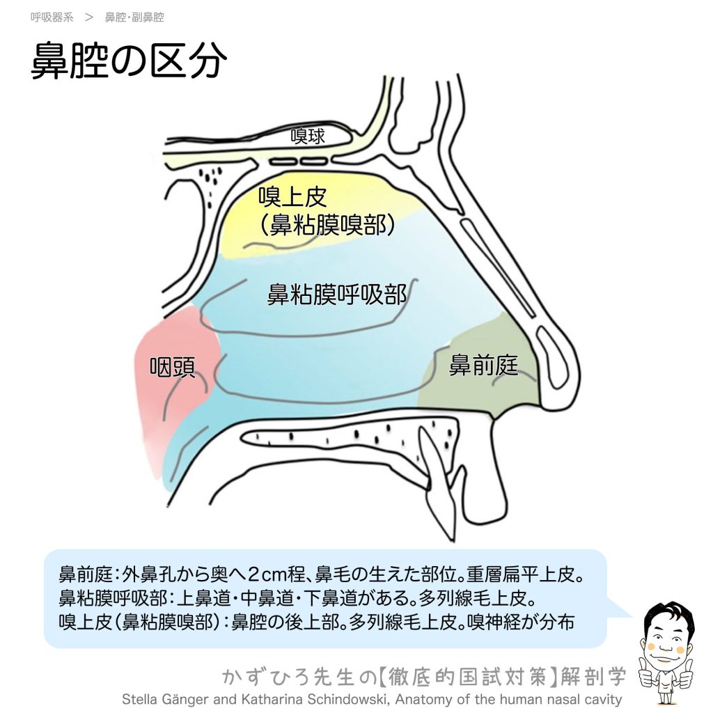 鼻腔の区分 - 完全攻略ガイド はじめに 鼻腔は単純な空洞ではなく、機能的に3つの部位に区分されています。各部位を覆う上皮の種類は国家試験で頻出のテーマです。この記事では、鼻腔の区分とそれぞれの特徴を詳しく解説します。 詳しい解説 鼻腔の3つの区... -