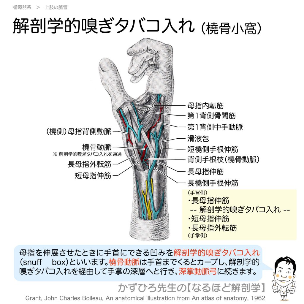 解剖学的嗅ぎタバコ入れ(橈骨小窩) - 完全攻略ガイド はじめに 解剖学的嗅ぎタバコ入れ(snuff box)は、母指を伸展させた時に手首の橈側にできる三角形の陥凹です。この部位は橈骨動脈の触診や舟状骨骨折の診察において臨床的に非常に重要です。かつて... -