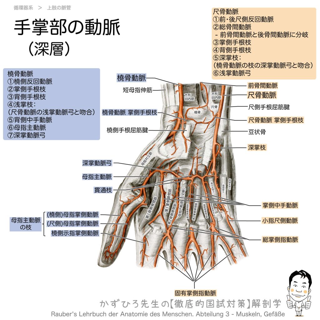 手掌部の動脈(表層) - 完全攻略ガイド はじめに 手掌部の動脈は、橈骨動脈と尺骨動脈が手部で形成する動脈弓が中心です。表層では浅掌動脈弓が重要で、これは主に尺骨動脈から形成されます。手掌の血管分布と、指への血液供給の仕組みを理解しましょう。... -