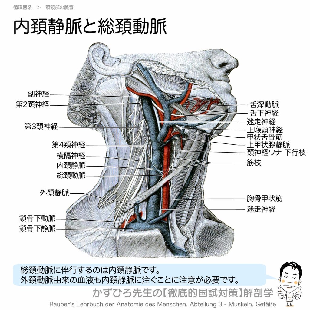 内頚静脈と総頚動脈 - 完全攻略ガイド はじめに 総頚動脈と内頚静脈は頚動脈鞘に包まれて頚部を走行します。頚動脈鞘の内容物(総頚動脈・内頚静脈・迷走神経)の位置関係は国家試験で頻出のポイントです。外頚動脈由来の血液も内頚静脈に還流するという点... -