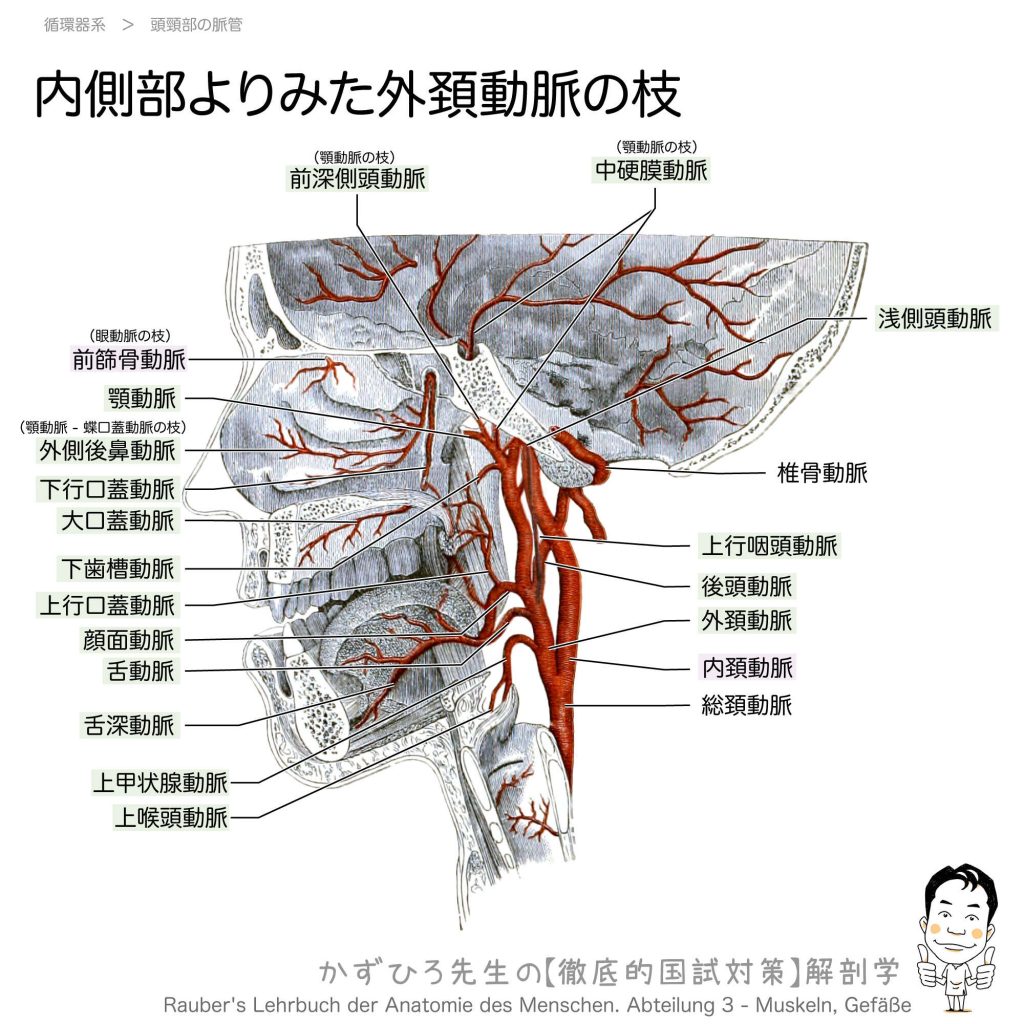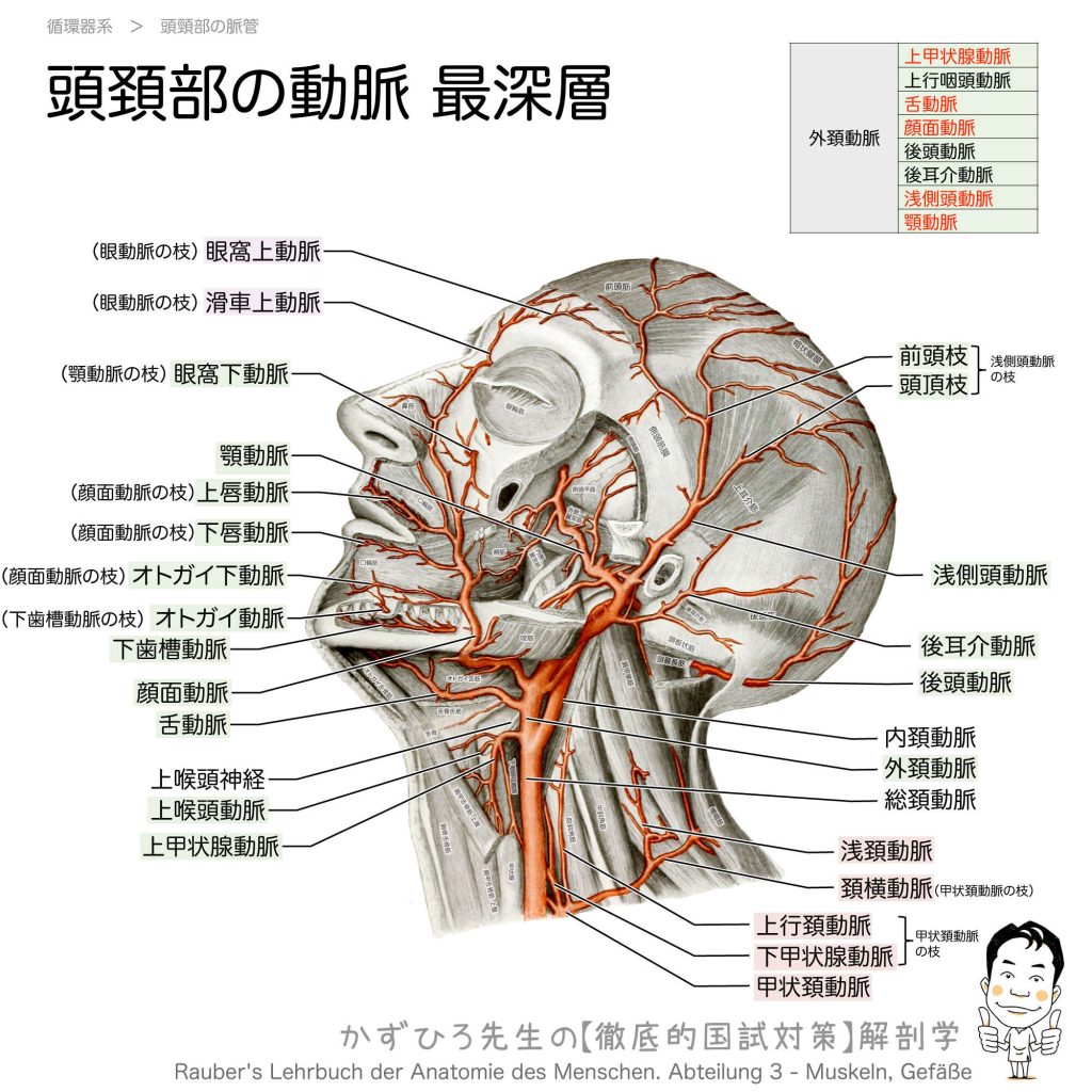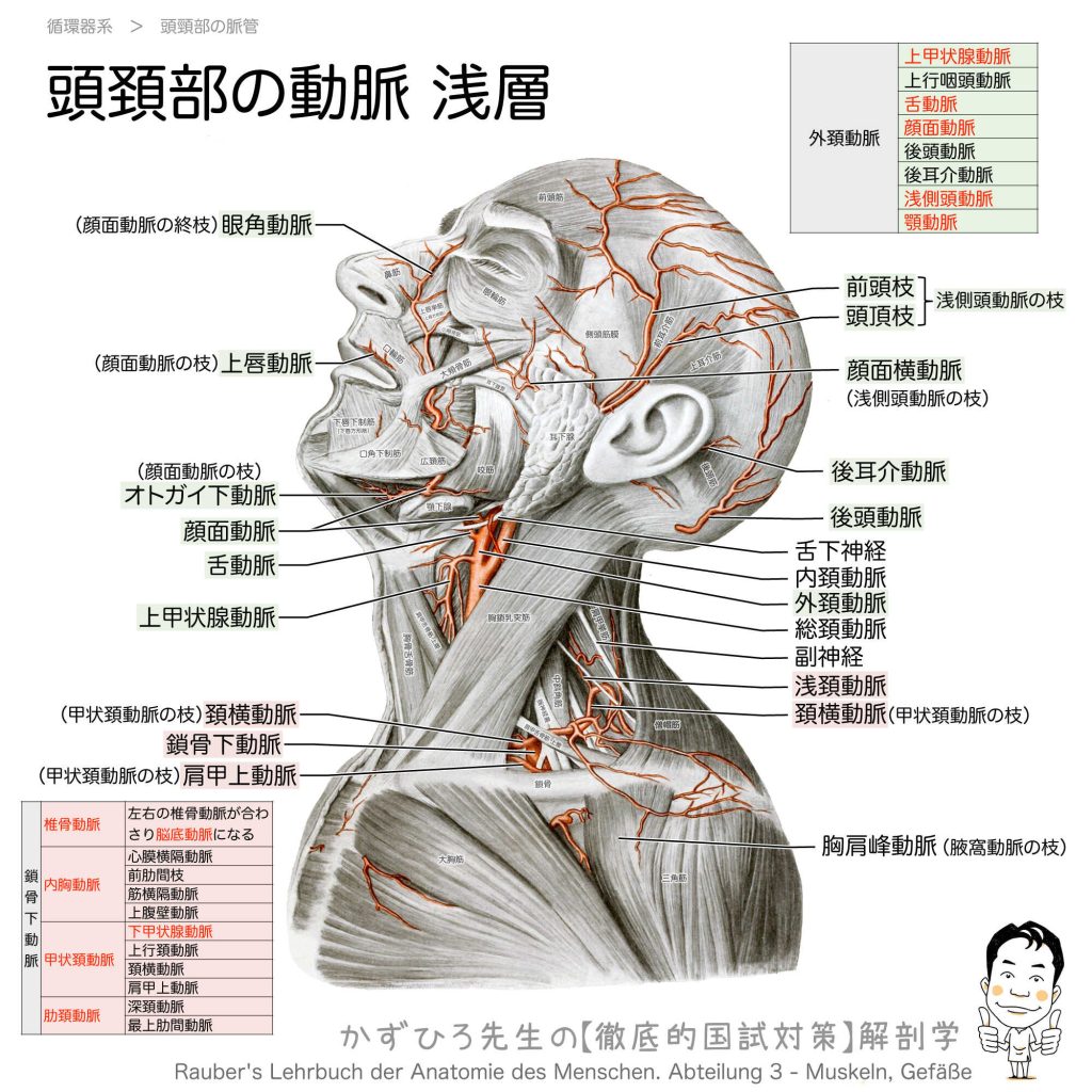 頭頚部の動脈(浅層) - 完全攻略ガイド はじめに 頭頚部浅層の動脈では、外頚動脈の枝が重要です。特に顔面動脈は顔面を蛇行しながら走行し、眼角動脈として終わります。浅側頭動脈は側頭部の主要動脈で、こめかみで脈拍を触知できます。外頚動脈の8つの... -