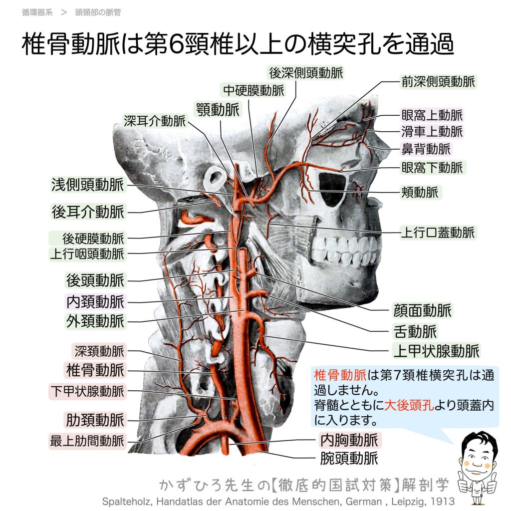 椎骨動脈の走行 - 完全攻略ガイド はじめに 椎骨動脈は鎖骨下動脈から分岐し、第6頚椎から第1頚椎までの横突孔を通過して大後頭孔から頭蓋内に入ります。C7の横突孔は通過しないという点が国家試験で頻出です。左右の椎骨動脈は合流して脳底動脈となり、脳... -