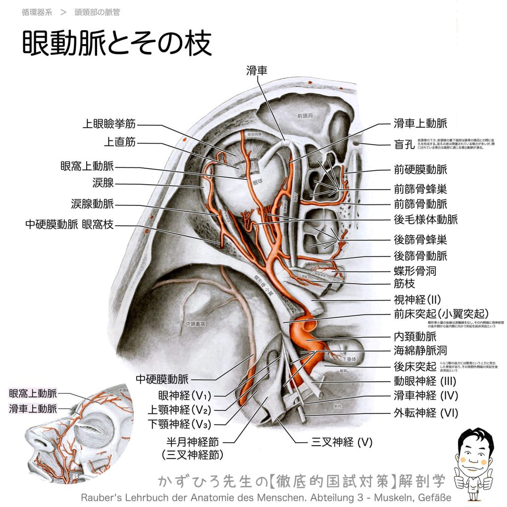 眼動脈とその枝 - 完全攻略ガイド はじめに 眼動脈は内頚動脈から分岐し、視神経管を通過して眼窩に入る重要な動脈です。網膜中心動脈をはじめとする多くの枝を出して眼球と眼窩を栄養します。海綿静脈洞内を通過する構造物との関係も国家試験で頻出のポイ... -