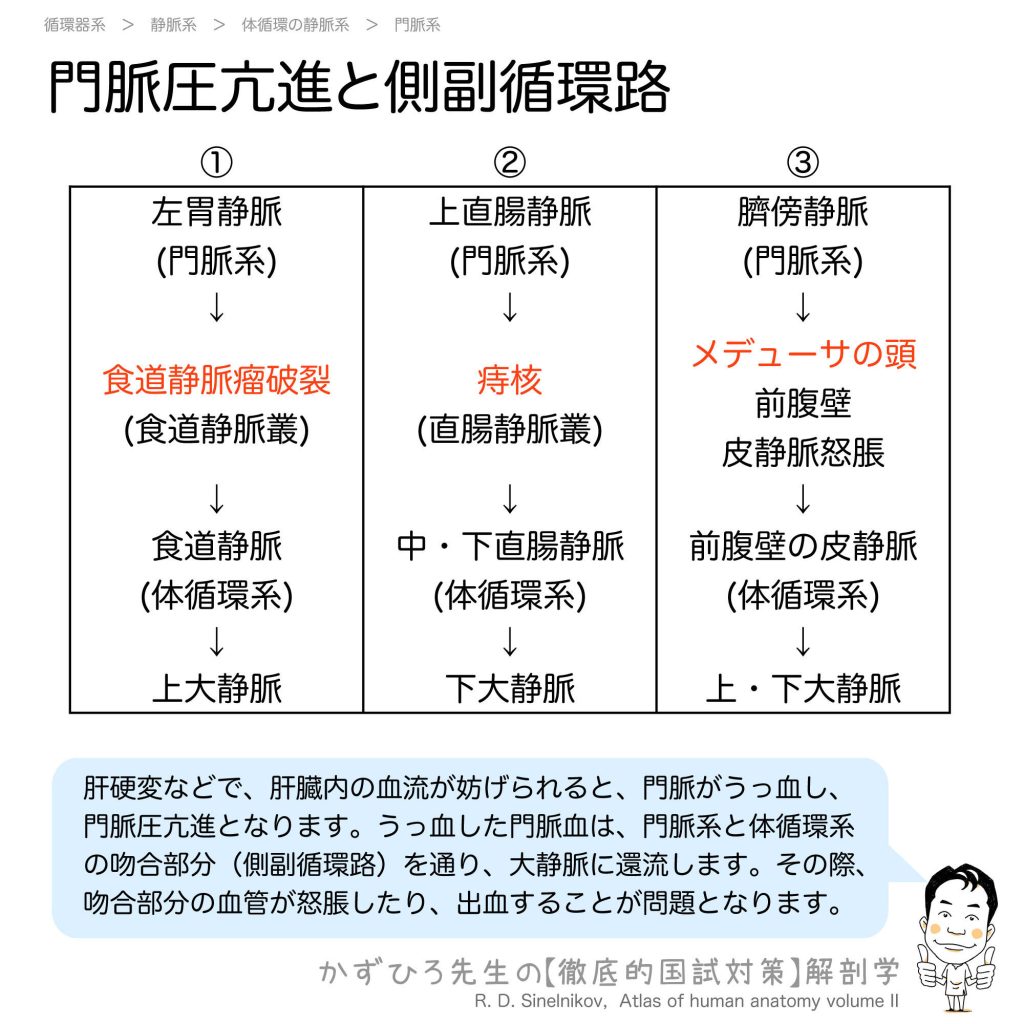 門脈圧亢進と側副循環路 - 完全攻略ガイド はじめに 肝硬変などで肝臓内の血流が妨げられると、門脈がうっ血し門脈圧亢進となります。門脈圧亢進時には、門脈系と体循環系の吻合部で特徴的な症状が現れます。国家試験でも超頻出のテーマです。 詳しい解説 ...