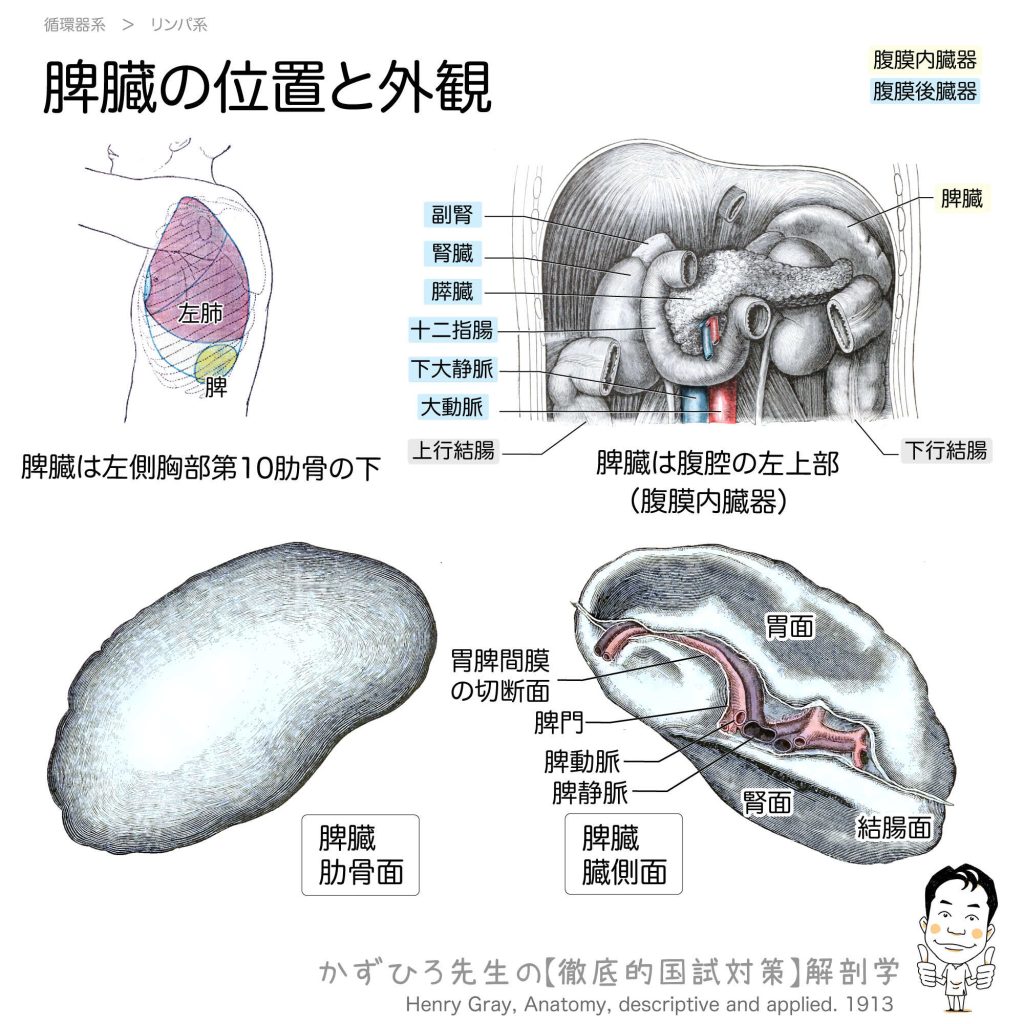 脾臓の位置と外観 - 完全攻略ガイド はじめに 脾臓は左側胸部第10肋骨の下、腹腔の左上部にある腹膜内臓器です。脾門から脾動脈と脾静脈が出入りし、脾静脈は門脈に合流します。国家試験で超頻出のテーマです。 詳しい解説 脾臓の位置 項目 詳細 位置 左季... -