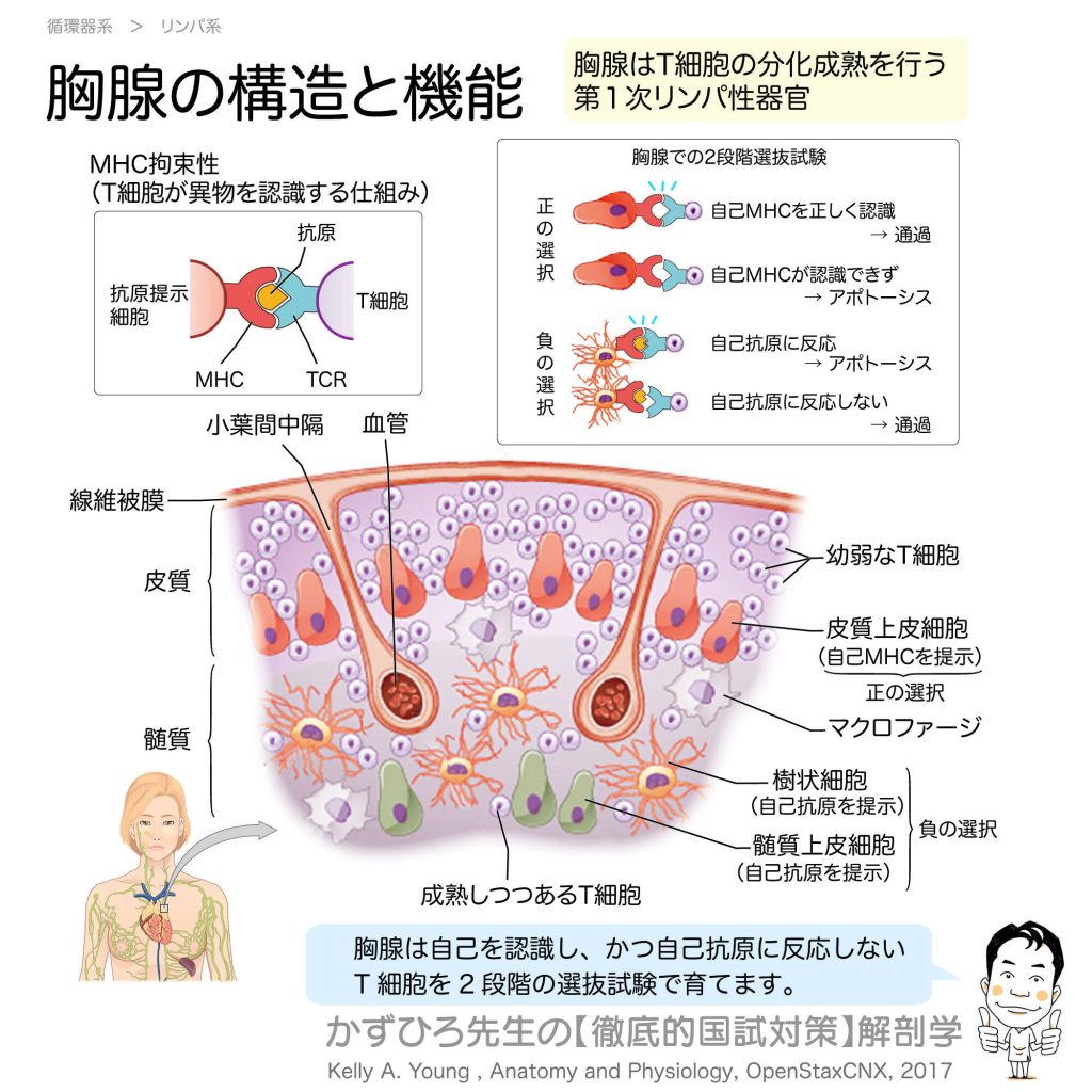 胸腺の内部構造 - 完全攻略ガイド はじめに 胸腺はT細胞の分化成熟を行う第一次リンパ性器官です。皮質で正の選択、髄質で負の選択を行い、自己を認識しかつ自己抗原に反応しないT細胞を育てます。国家試験で超頻出のテーマです。 詳しい解説 胸腺の構造 ... -