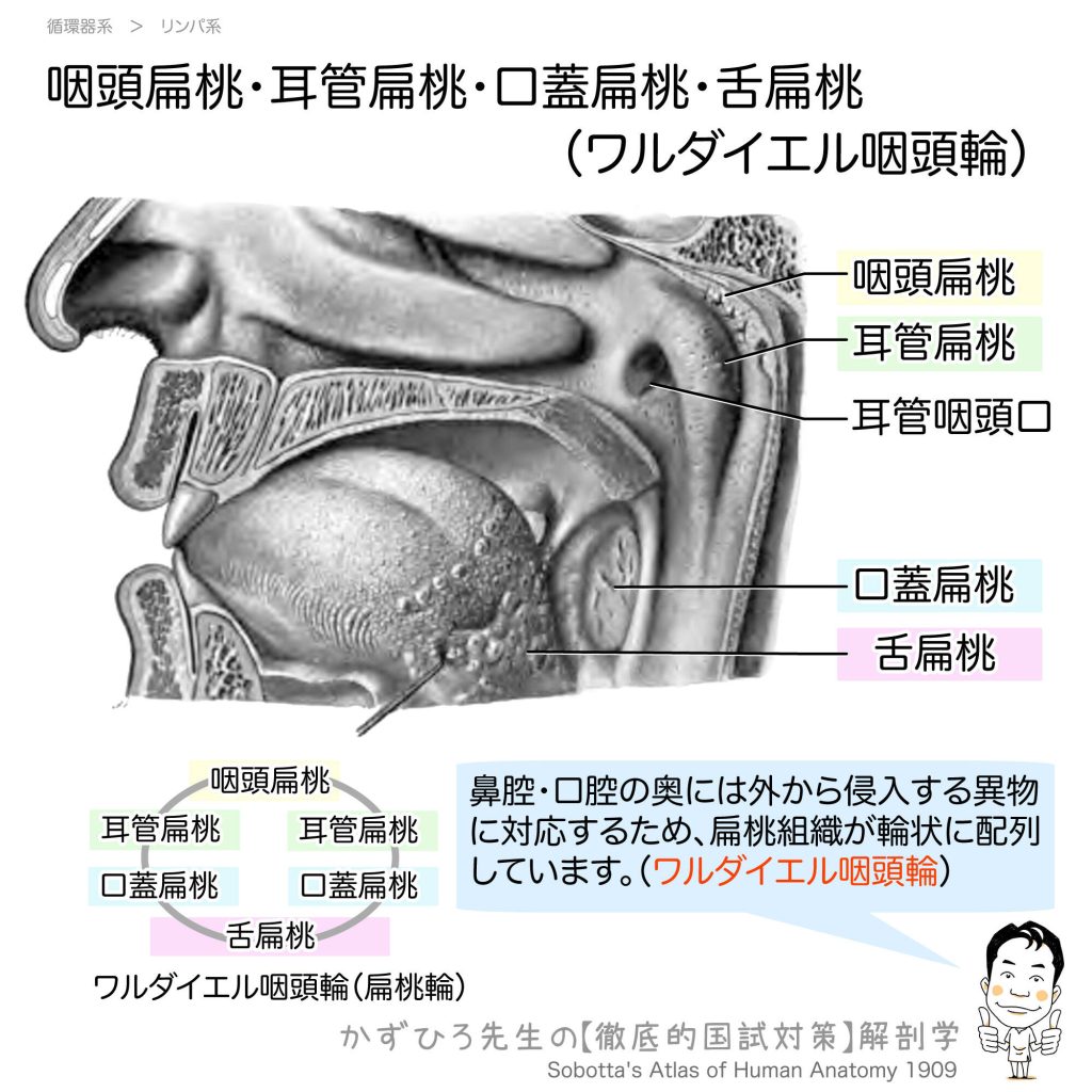 ワルダイエル咽頭輪 - 完全攻略ガイド はじめに 鼻腔・口腔の奥には外から侵入する異物に対応するため、扁桃組織が輪状に配列しています。これをワルダイエル咽頭輪といい、咽頭扁桃、耳管扁桃、口蓋扁桃、舌扁桃で構成されます。国家試験で超頻出のテーマ... -