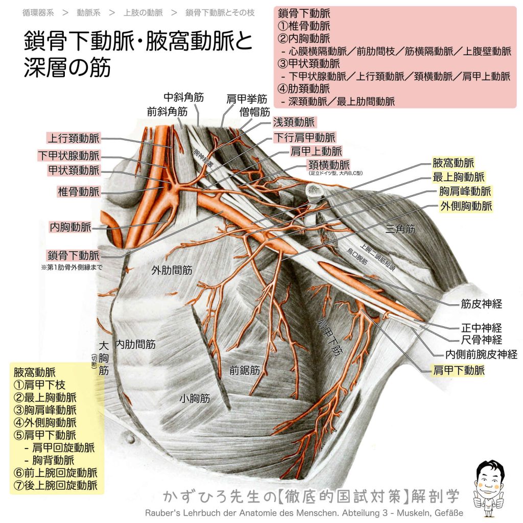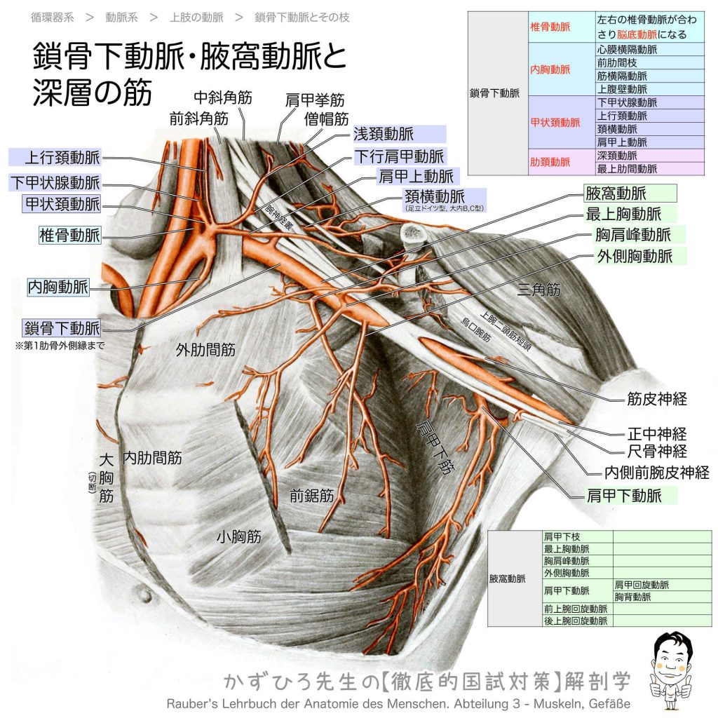 鎖骨下動脈・腋窩動脈と深層の筋 - 完全攻略ガイド はじめに 鎖骨下動脈は「ツナコロッケ」の4つの枝を出します。第1肋骨外側縁を越えると腋窩動脈になり、大円筋下縁で上腕動脈になります。国家試験で超頻出のテーマです。 詳しい解説 鎖骨下動脈の枝 枝 ... -