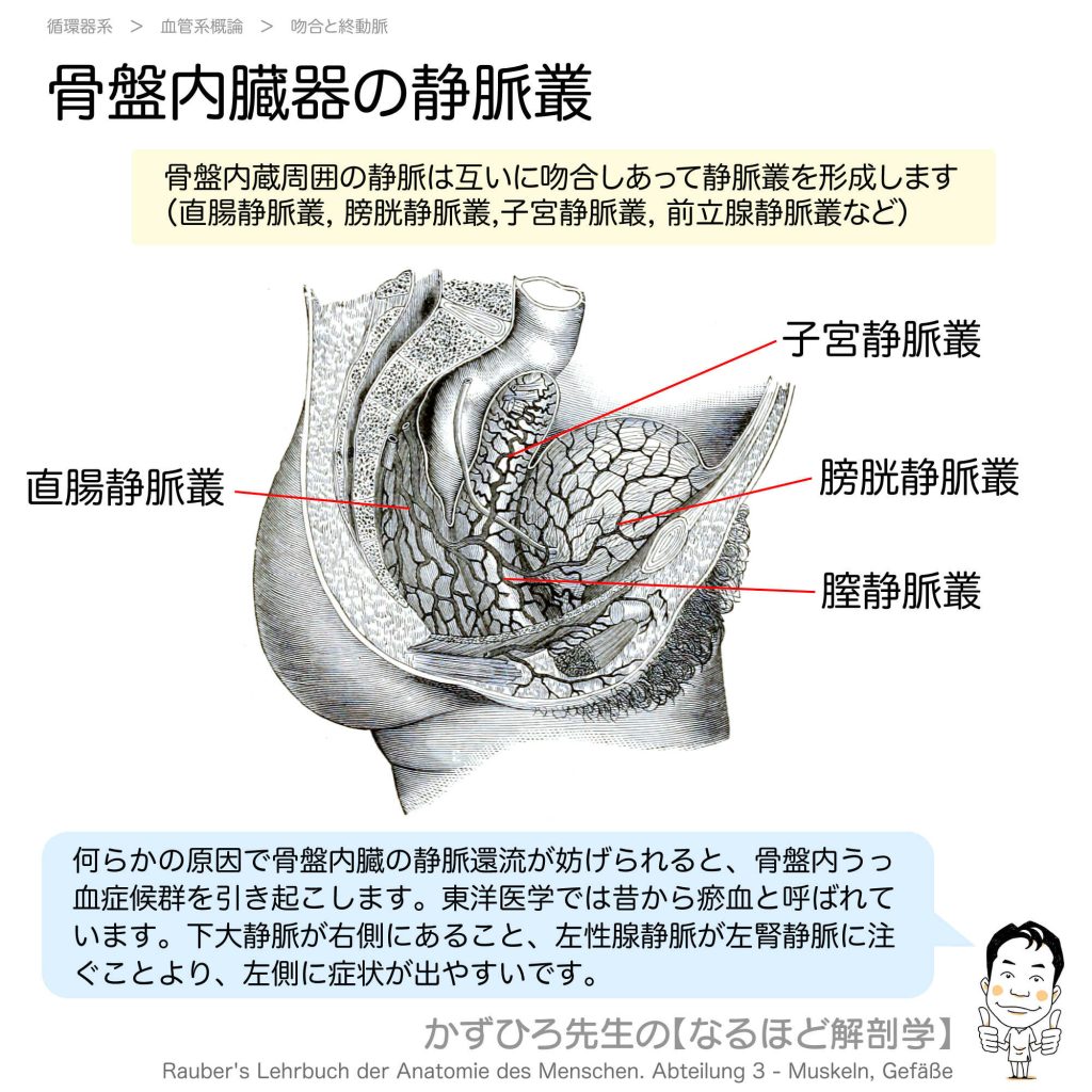 骨盤内臓器の静脈叢 - 完全攻略ガイド はじめに 骨盤内の臓器周囲には、静脈が互いに吻合しあって「静脈叢」を形成しています。直腸静脈叢、膀胱静脈叢、子宮静脈叢、前立腺静脈叢などがあり、これらの静脈還流が妨げられると「骨盤うっ血症候群」を引き起... -