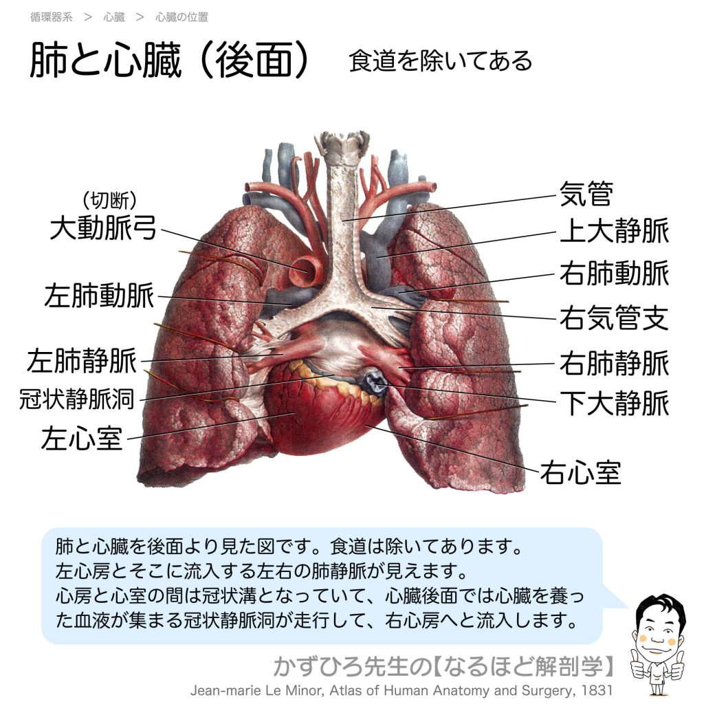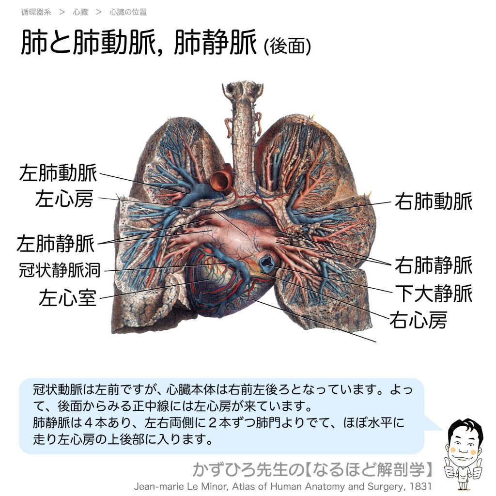 肺と肺動脈・肺静脈(後面) - 完全攻略ガイド はじめに 心臓を後面から観察すると、前面とは異なる構造が見えます。「心臓本体は右前左後ろ」という位置関係から、後面では正中線に左心房が来ています。肺静脈は4本あり、ほぼ水平に走行して左心房に入り... -