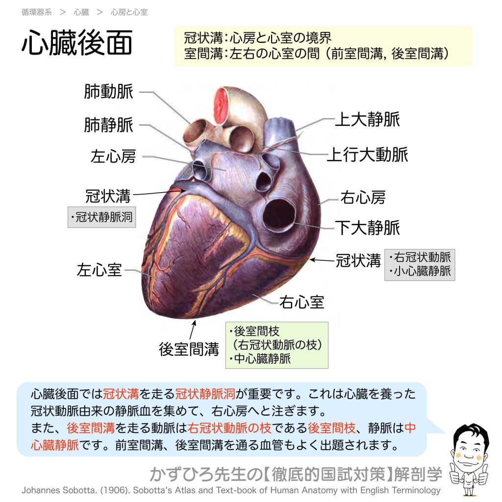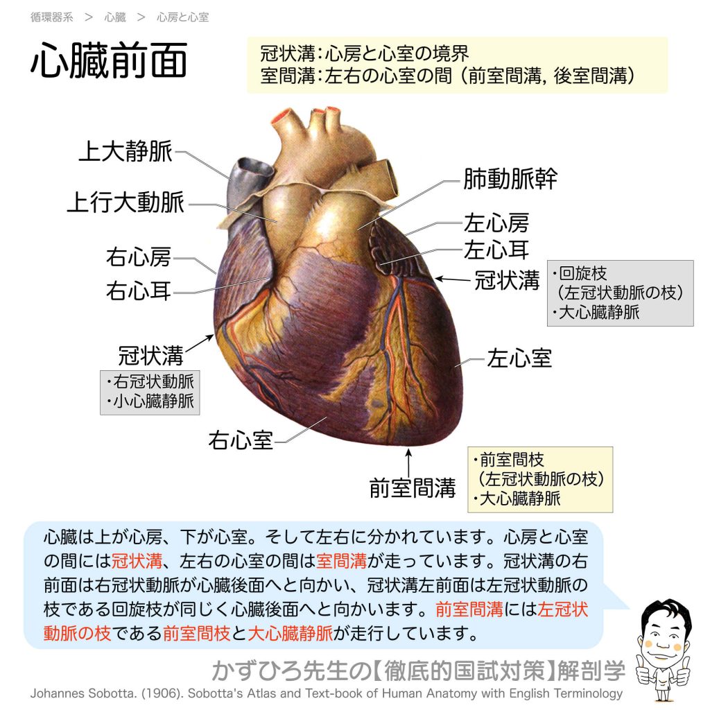 心臓前面 - 完全攻略ガイド はじめに 心臓の前面からは、右心房・右心室・左心室、そして冠状動脈の主要な枝を観察できます。冠状溝と室間溝、そしてそこを走行する血管は国家試験で頻出のテーマです。この記事では、心臓前面の解剖を詳しく解説します。 ... -
