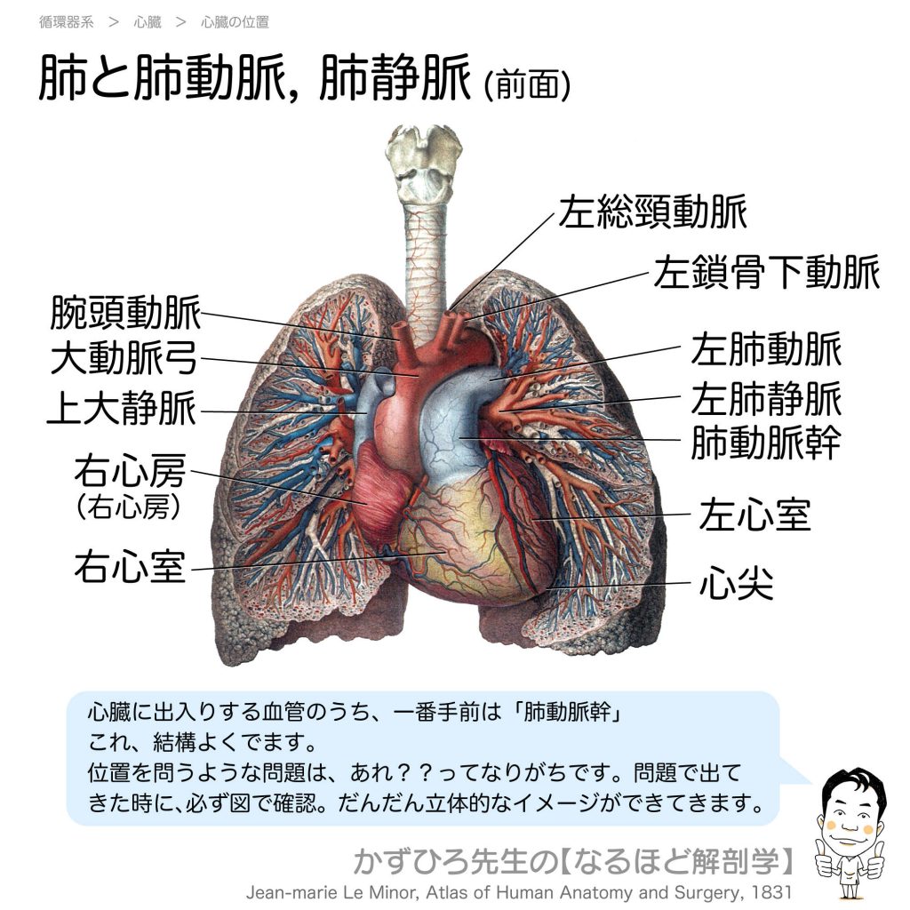 肺と肺動脈・肺静脈(前面) - 完全攻略ガイド はじめに 心臓前面の血管の位置関係は国家試験で頻出です。特に「心臓に出入りする血管のうち、一番手前は肺動脈幹」という点が重要です。大動脈弓の3つの枝の順序も併せて覚えましょう。 詳しい解説 心臓前... -