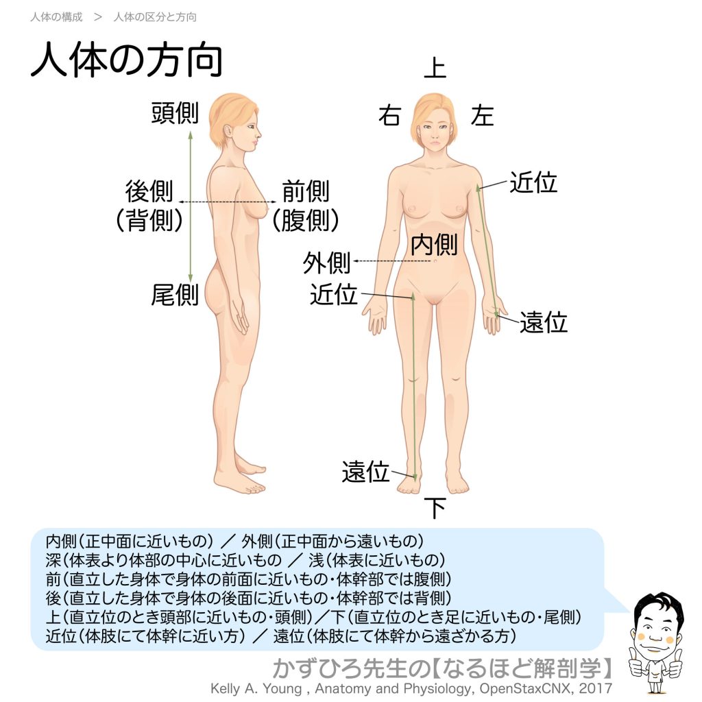 人体の方向 - 完全攻略ガイド はじめに 解剖学的正位(直立し、手掌を前に向けた姿勢)を基準に、人体の位置関係を表す用語が定められています。内側・外側、近位・遠位などの用語を正確に理解することが重要です。今回は人体の方向について詳しく解説しま... -