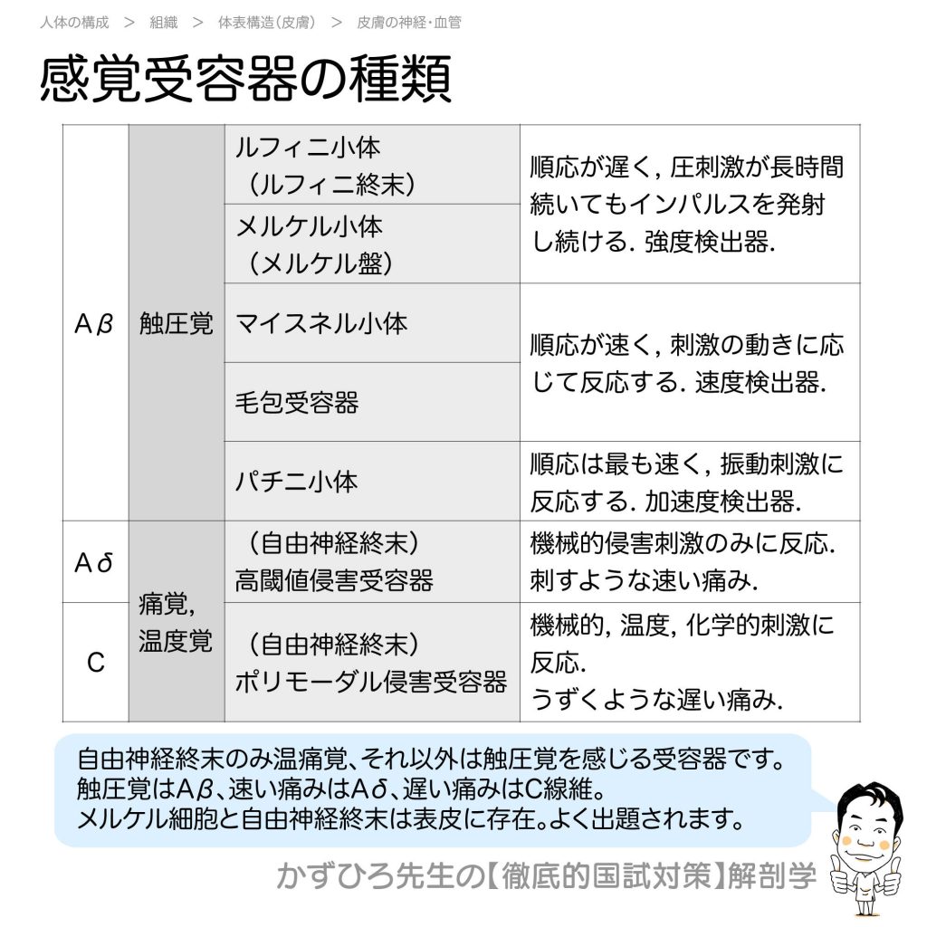 感覚受容器の種類 - 完全攻略ガイド はじめに 感覚受容器は感知する刺激の種類と伝える神経線維によって分類されます。触圧覚はAβ線維、速い痛みはAδ線維、遅い痛みはC線維で伝えられます。今回は感覚受容器の種類について詳しく解説します。 詳しい解説 ... -