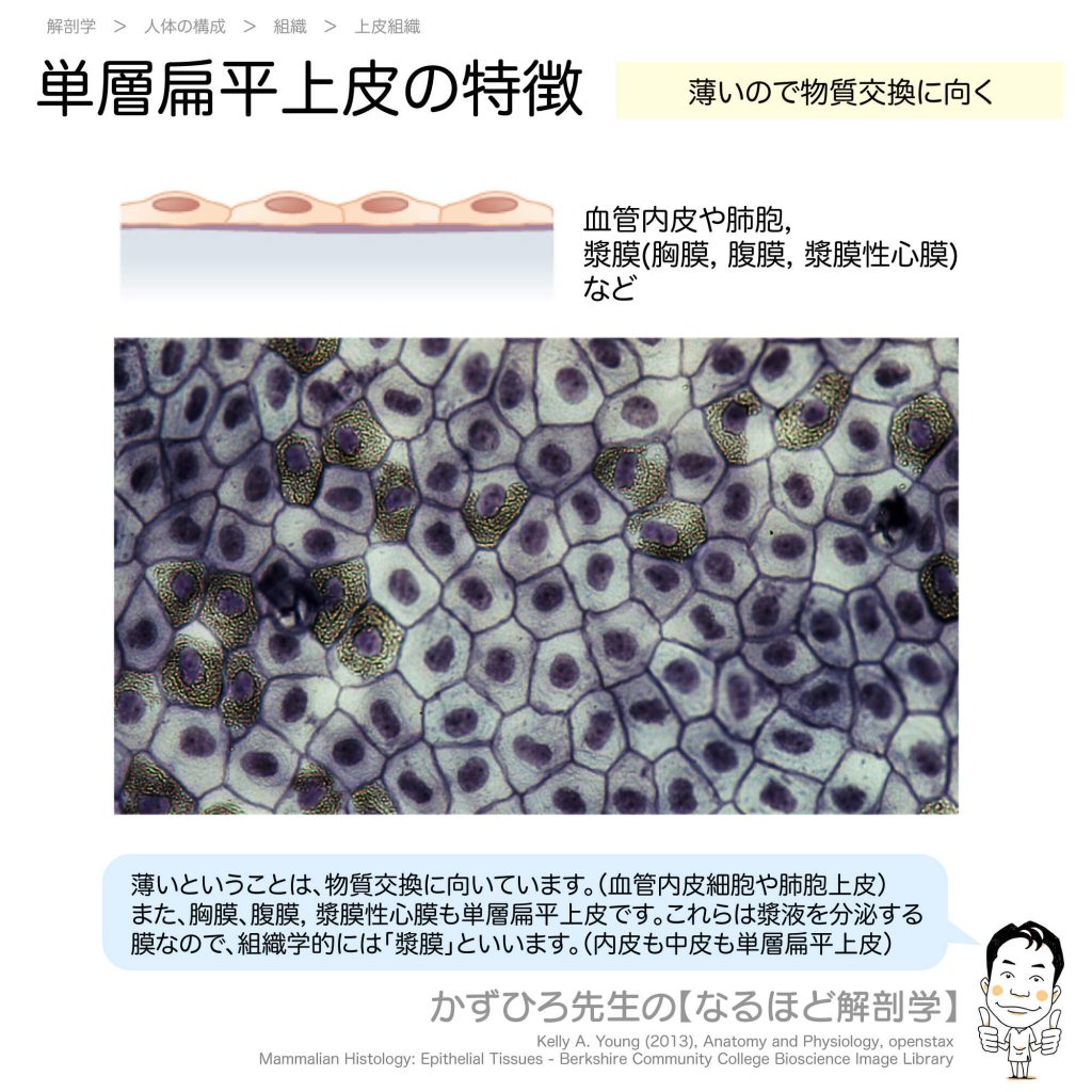 単層扁平上皮の特徴 - 完全攻略ガイド はじめに 単層扁平上皮は、薄い扁平な細胞が1層に並んだ上皮です。その薄さを活かして、物質交換やガス交換が必要な場所に存在します。血管内皮や肺胞など、国家試験で頻出の部位に分布しています。今回は単層扁平上... -