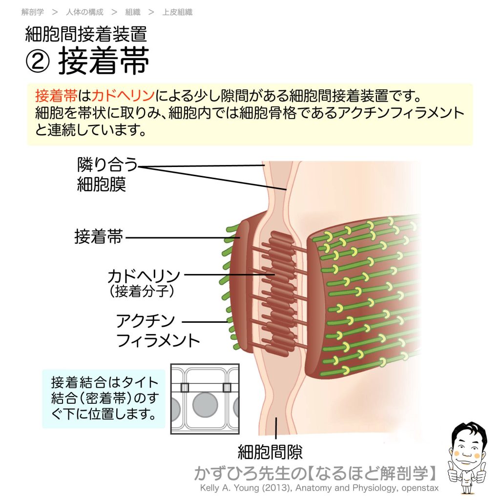 接着帯 - 完全攻略ガイド はじめに 接着帯は細胞間接着装置の一つで、カドヘリンという接着分子によって細胞同士を結合します。タイト結合のすぐ下に位置し、細胞を帯状に取り囲んでいます。今回は接着帯の構造と機能について詳しく解説します。 詳しい解... -
