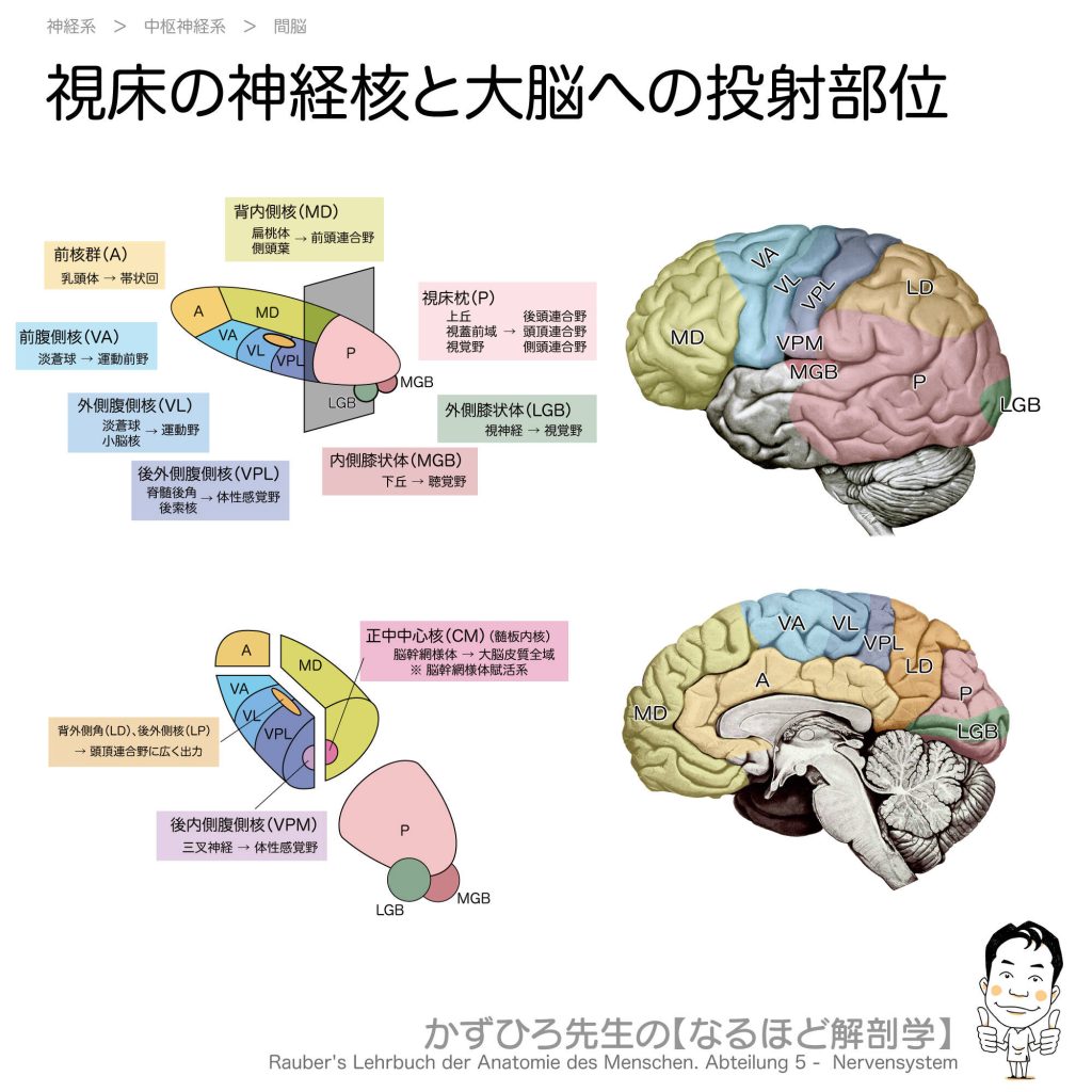 視床の神経核と大脳への投射部位