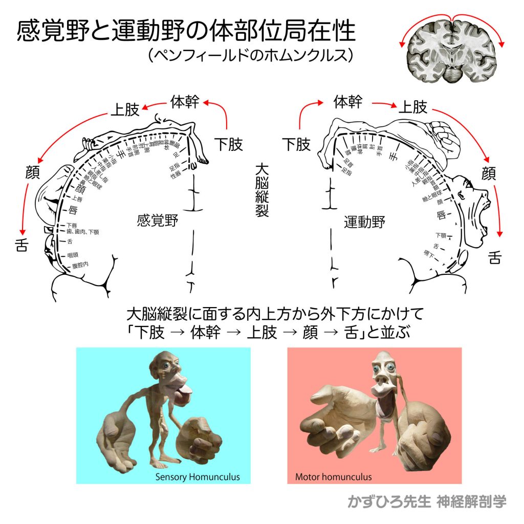 ホムンクルス(体部位局在性) - 完全攻略ガイド はじめに ペンフィールドのホムンクルス(小人)は、大脳皮質の運動野と感覚野における体部位局在を視覚的に表したものです。顔や手、舌など細かい制御が必要な部位ほど広い皮質領域を占めるため、ホムンク... -