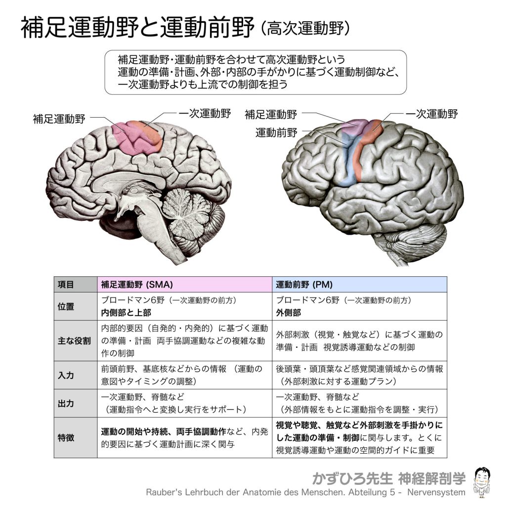 補足運動野と運動前野(高次運動野) - 完全攻略ガイド はじめに 一次運動野(4野)の前方には、運動の準備や計画を担う高次運動野が存在します。補足運動野(SMA)と運動前野(PM)を合わせて高次運動野と呼び、両者はブロードマン6野に位置しますが、異... -
