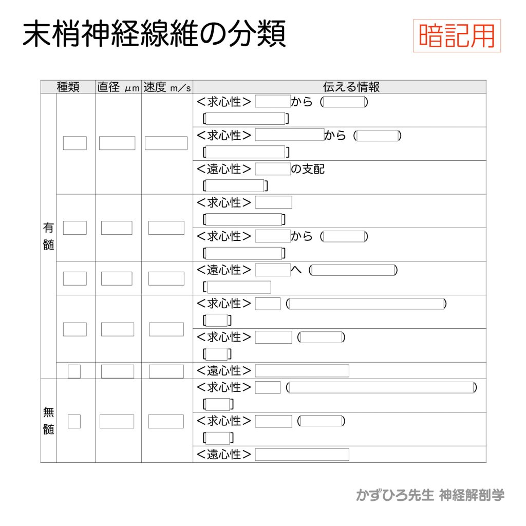 末梢神経線維の分類【暗記用】 - 完全攻略ガイド はじめに 末梢神経線維の分類は、国家試験において繰り返し出題される超重要テーマです。本記事は暗記に特化した構成で、空欄補充形式で学習した内容を確実に定着させることを目的としています。神経線維の... -