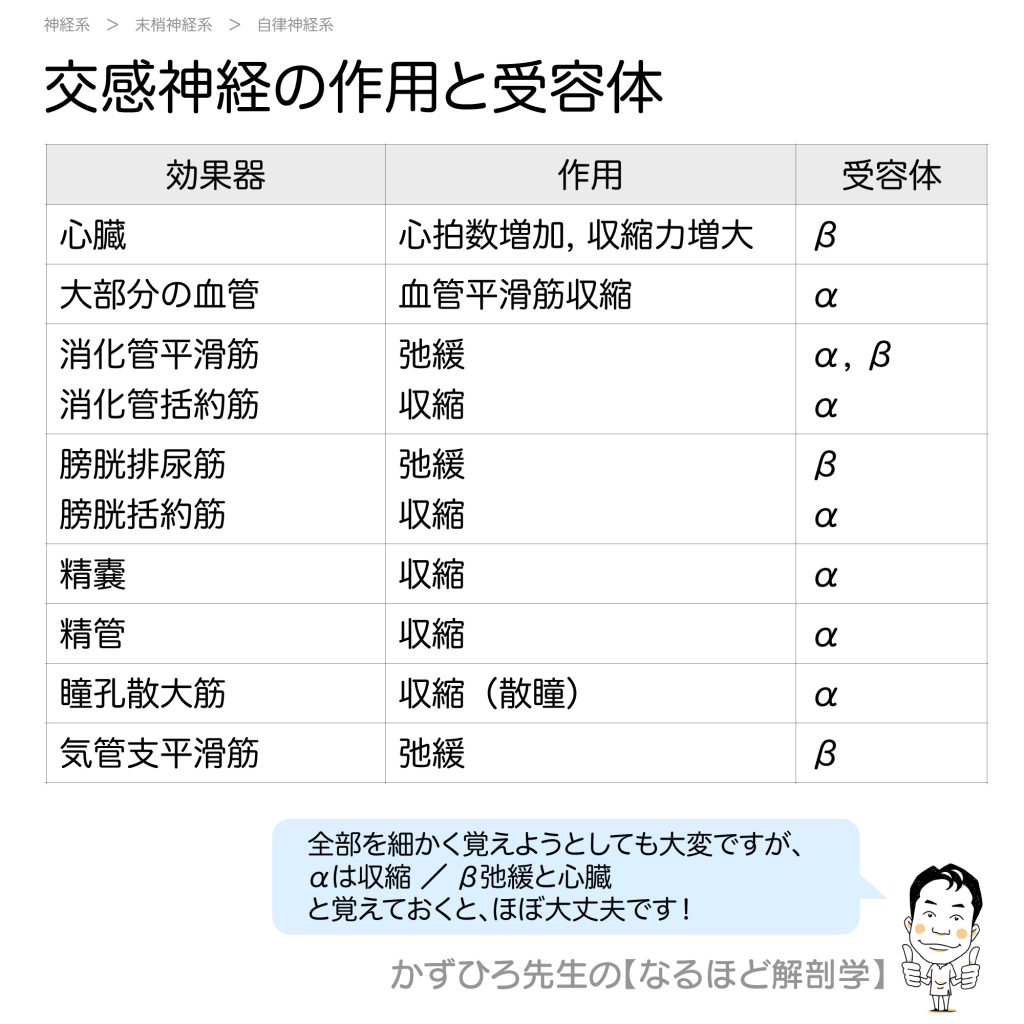 交感神経の作用と受容体(図表) - 完全攻略ガイド はじめに 交感神経の作用と受容体の関係を図表でまとめて整理しましょう。「αは収縮、β弛緩と心臓」という基本法則を押さえれば、ほぼ大丈夫です。この記事では、一覧表を使って効率的に学習できるようま... -