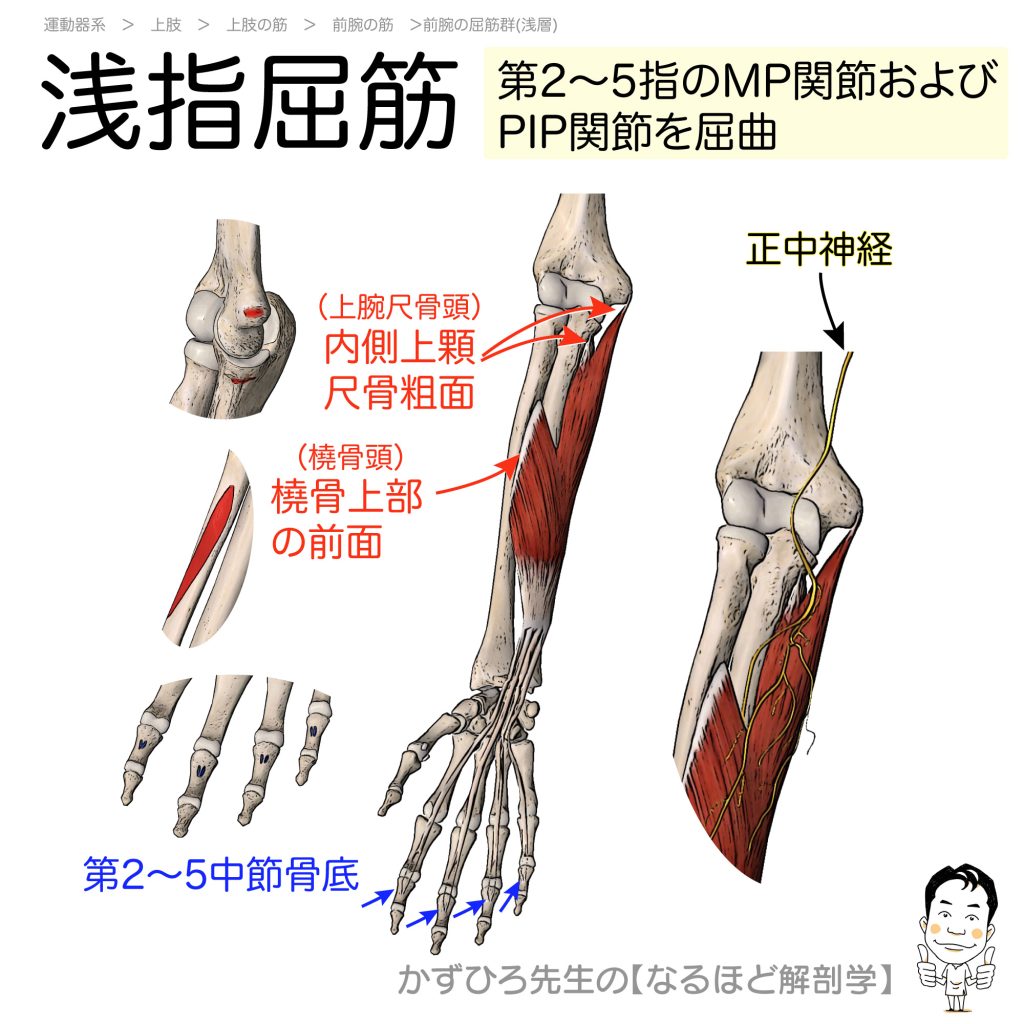 浅指屈筋 浅指屈筋は円回内筋、橈側手根屈筋、長掌筋、尺側手根屈筋の4筋におおわれ、上腕尺骨頭は内側上顆と尺骨粗面の内上側から、橈骨頭は橈骨の上部前面から起こり、合して長掌筋の下層を下り4腱に分かれて、第2~第5指の中節骨底の掌側面につきます。... -