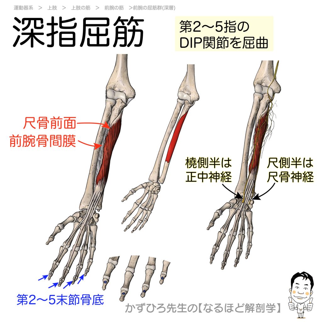 深指屈筋 深指屈筋は尺骨前面および前腕骨間膜から起こり、4腱に分かれて第2~第5指末節骨底につきます。第2~第5指のDIP関節を屈曲します。橈側半は正中神経、尺側半は尺骨神経の支配をうけます。 【起始】尺骨前面・前腕骨間膜 【停止】第2〜5末節骨底 ... -