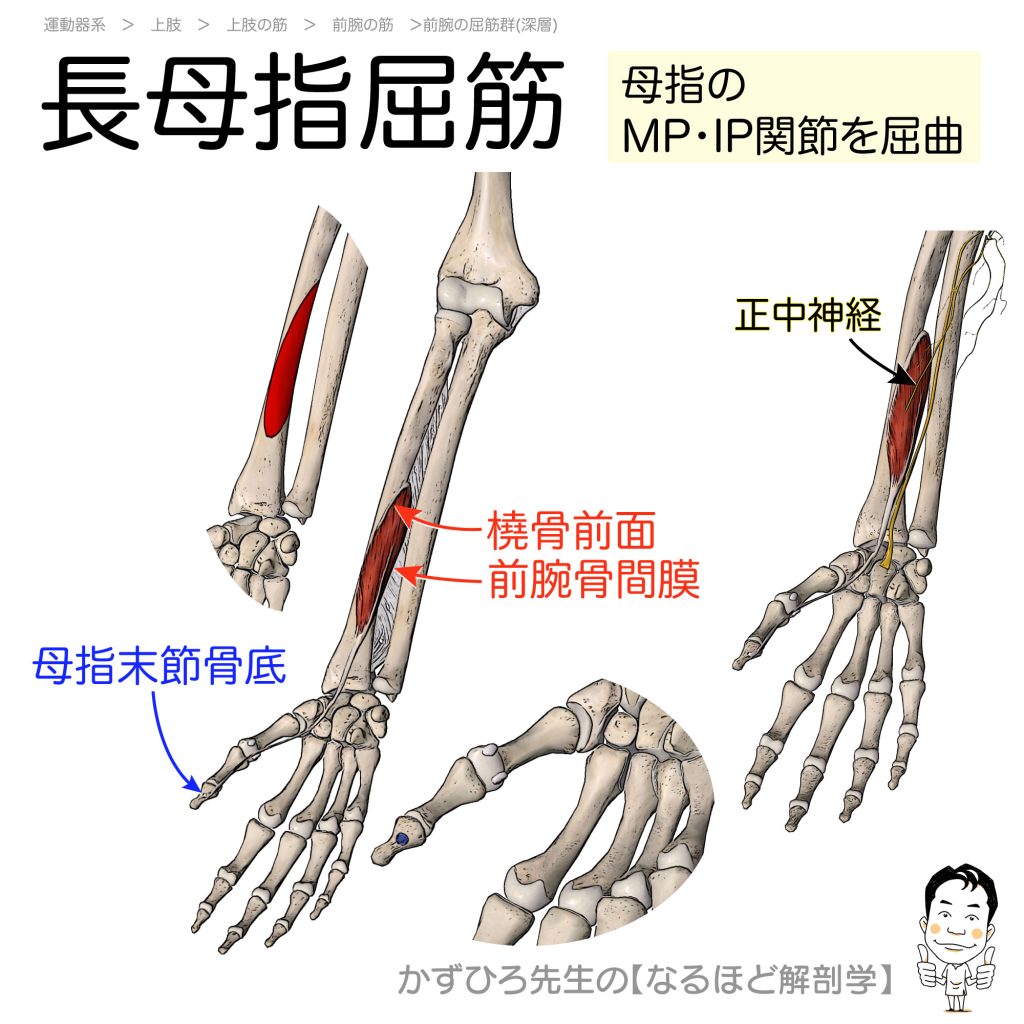 長母指屈筋 長母指屈筋は橈骨前面と前腕骨間膜から起こり、母指の末節骨底につきます。母指MP、IP関節を屈曲させます。正中神経の支配をうけます。 【起始】橈骨前面・前腕骨間膜 【停止】母指末節骨底 【支配神経】正中神経 【作用】母指のMP・IP関節を屈... -