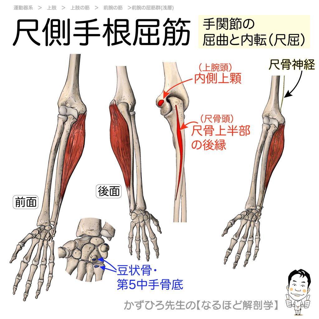 尺側手根屈筋 尺側手根屈筋はは上腕頭と尺骨頭からなり、前者は内側上顆から、後者は尺骨上半部の後縁から起こり、両者合して前腕の中ごろから細い腱となり、豆状骨・第5中手骨底につきます。手関節の屈曲と内転(尺屈)に作用します。尺骨神経の支配を受... -