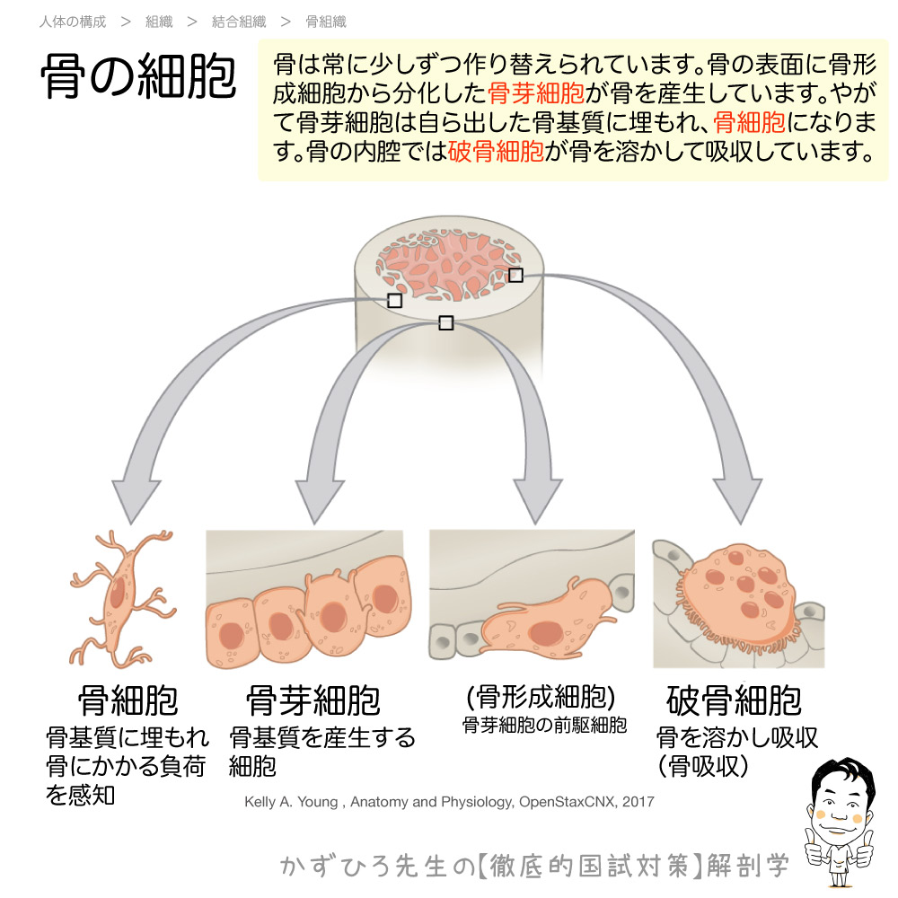 骨の細胞 骨は常に少しずつ作り替えられています。骨の表面に骨形成細胞から分化した骨芽細胞が骨を産生しています。やがて骨芽細胞は自ら出した骨基質に埋もれ、骨細胞になります。骨の内腔では破骨細胞が骨を溶かして吸収しています。 骨芽細胞 骨芽細胞... -