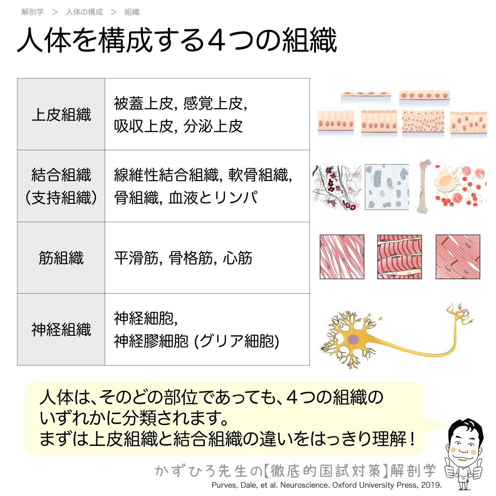 人体を構成する4つの組織 同じ形態と機能を持つ細胞が集まり、一定の規律に従い配列したものを組織といいます。組織には4つに分かれます。 ▶ 上皮組織と結合組織の違いについて 組織では、細胞のほかに、細胞の間を埋める物質、すなわち細胞間質(細胞間... -