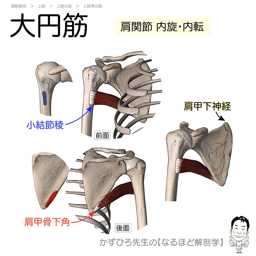 大円筋 大円筋は小円筋の下方で肩甲骨下角より起こり前外方に向かい、上腕骨小結節稜につきます。上腕骨を内旋・内転します。肩甲下筋とともに肩甲下神経の支配を受けます。 【起始】肩甲骨 下角 【停止】小結節稜 【支配神経】肩甲下神経 【作用】肩関節 ... -