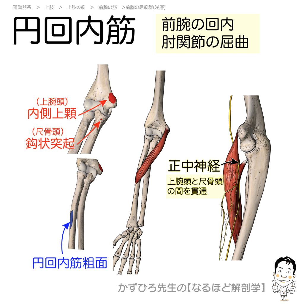 円回内筋 円回内筋は2頭をもち、上腕頭は上腕骨の内側上顆から、尺骨頭は尺骨の鈎状突起から起こり、両頭合して橈骨中部の外側面(円回内筋粗面)につきます。前腕を回内させ、肘関節を屈曲します。正中神経により支配されます。円回内筋上腕頭と尺骨頭の... -