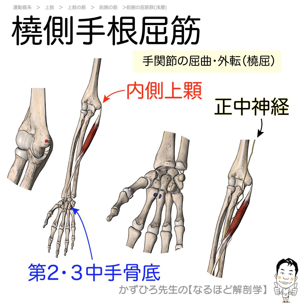橈側手根屈筋 橈側手根屈筋は上腕骨内側上顆から起こり、下外方に向かい第2・3中手骨底に停止します。手関節の屈曲・外転(橈屈)させます。正中神経による支配を受けます。 【起始】内側上顆 【停止】第2・3中手骨底 【支配神経】正中神経 【作用】手関節... -