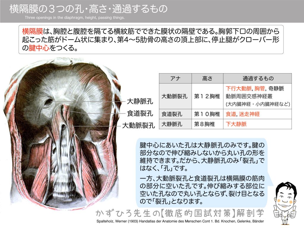 横隔膜の3つの孔(大動脈裂孔・食道裂孔・大静脈孔)・高さ・通過するもの